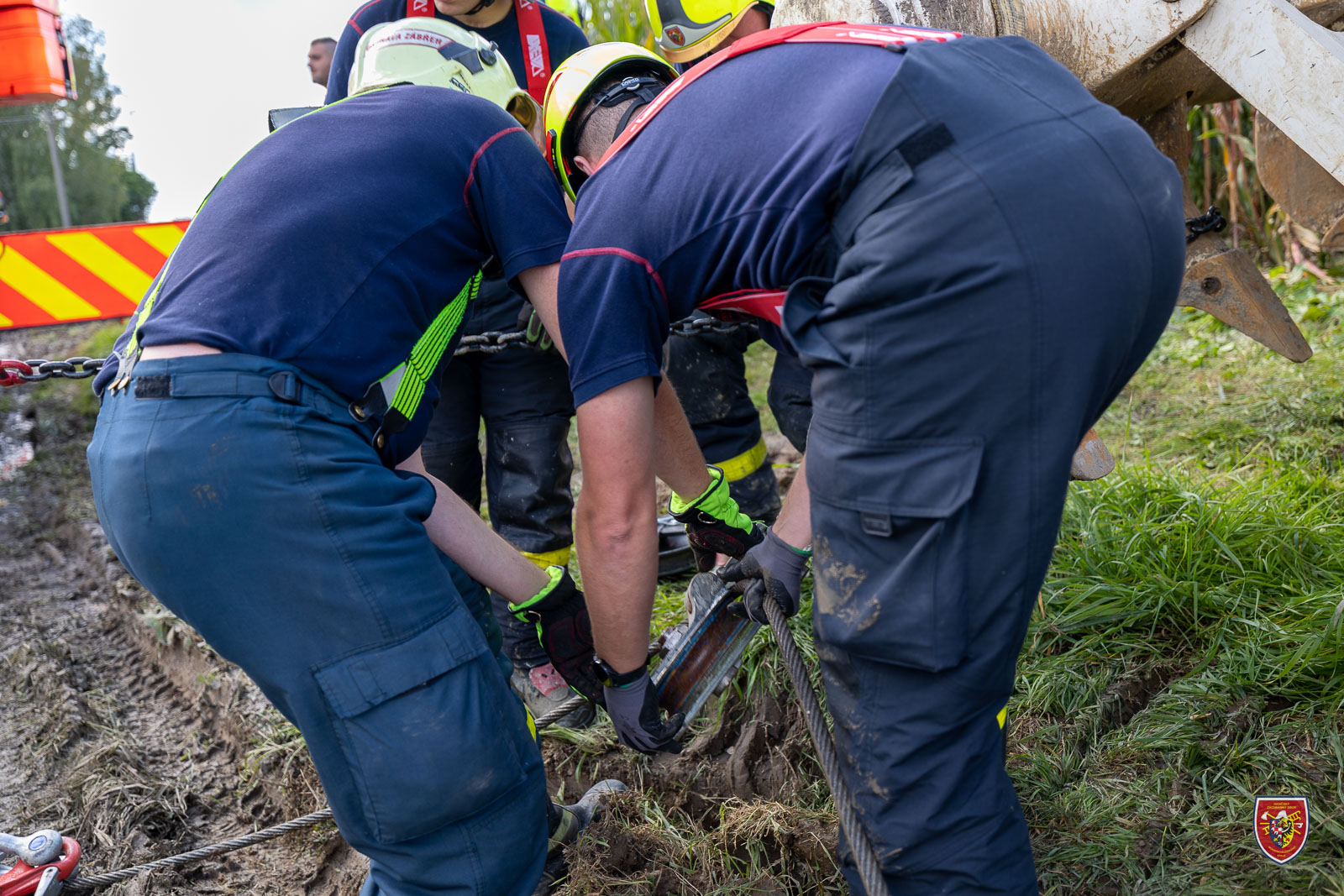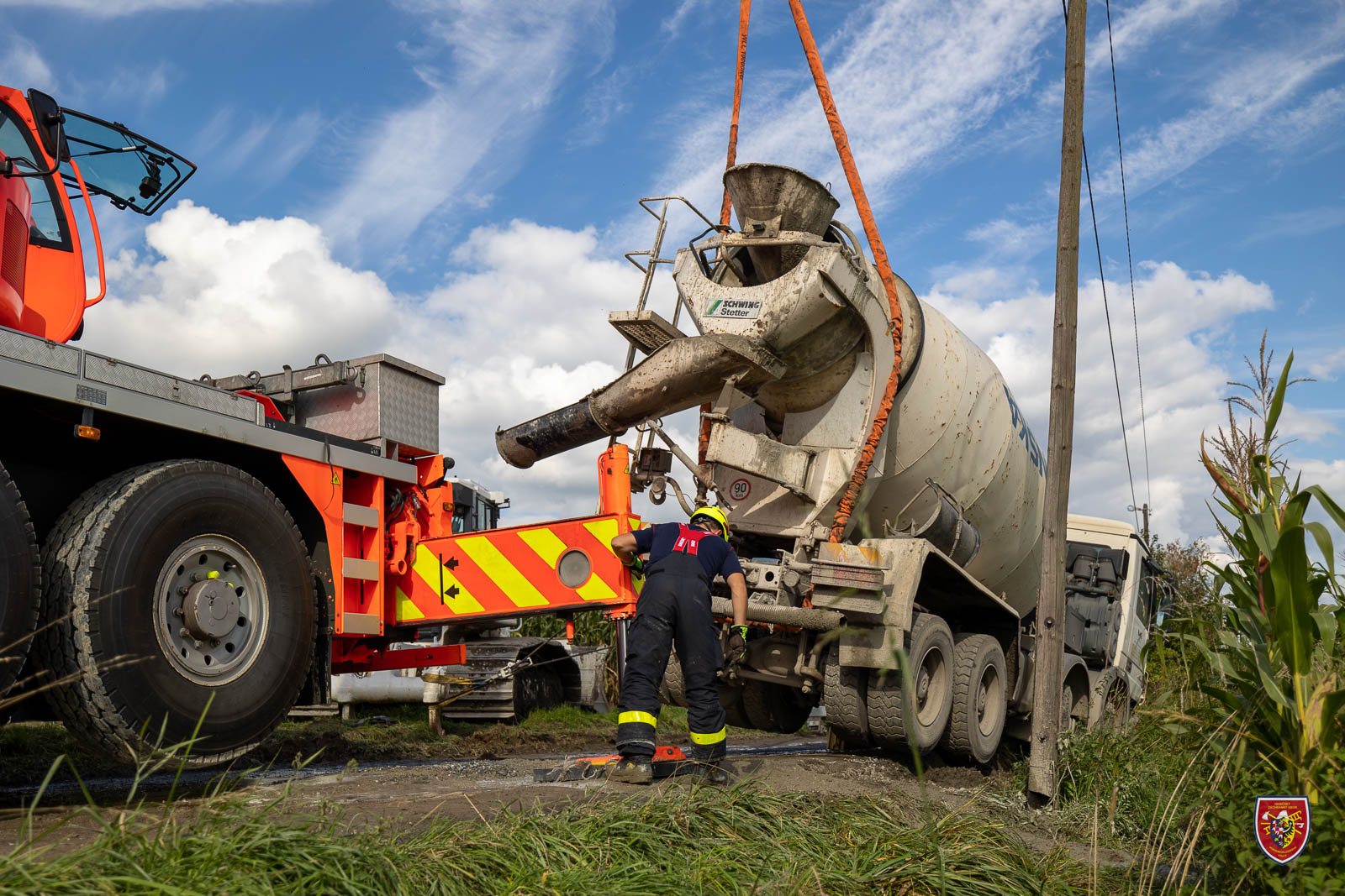 Před započetím vyprošťovacích prací se podařilo z domíchávače přeložit beton do náhradního domíchávače. Následně došlo ze strany hasičů k preciznímu vyproštění vozidla pomocí automobilového jeřábu a vyprošťovacího automobilu. Hasiči prvně přizvedli jeřábem zadní nápravu domíchávače, kterou usadili zpět na komunikaci. Následně pod přední kola uložili připravené dřevěné hranoly, po kterých pomocí navijáku z jeřábu vozidlo vytáhli zpět na silnici. Po celou dobu vyprošťování byl domíchávač jištěn proti převrácení navijákem vyprošťovacího automobilu.