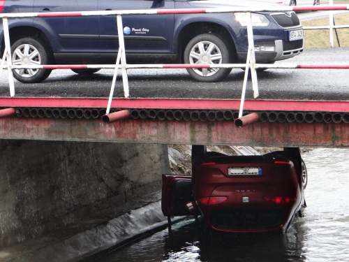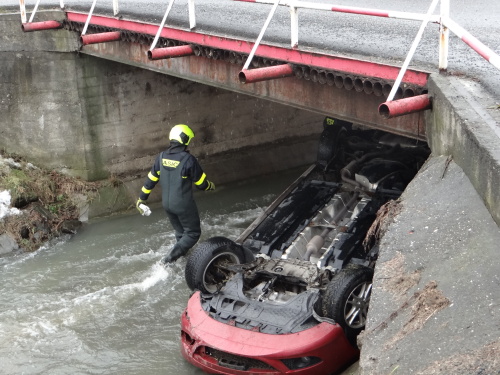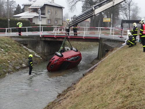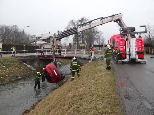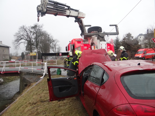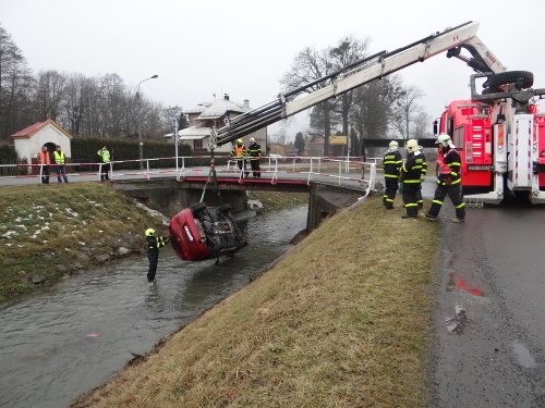 Snad nejkomplikovanější byla nehoda osobního automobilu Seat Leon ve Velkých Albrechticích, který skončil pod mostem, tedy špatně dosažitelný pro řádné zavěšení na hydraulickou ruku hasičského vyprošťovacího speciálu Mercedes Actros Bizon. Z auta ve vodě na střeše unikly dvě cestující, jedna z nich byla zraněná.