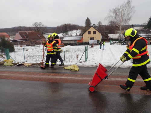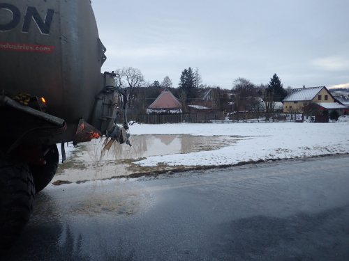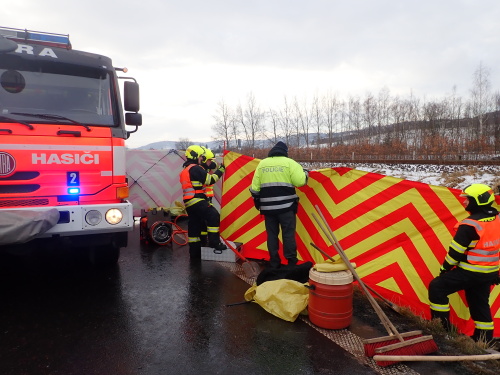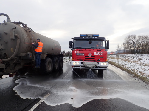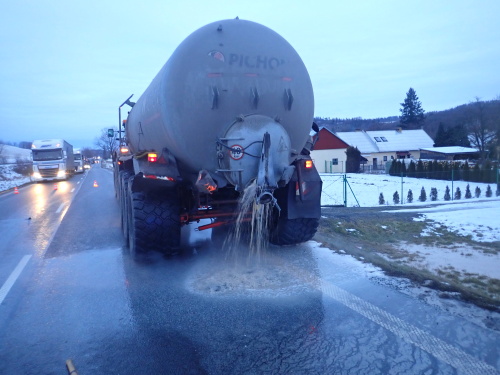 Kvůli poškození výpustného ventilu plné cisterny unikl do půdy její kapalný obsah, který původně směřoval do bioplynové stanice. Měl by ale být neškodný. Hasiči informovali o nehodě havarijní službu České inspekce životního prostředí a dispečink státního podniku Povodí Odry.