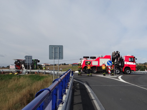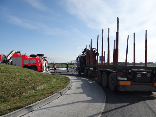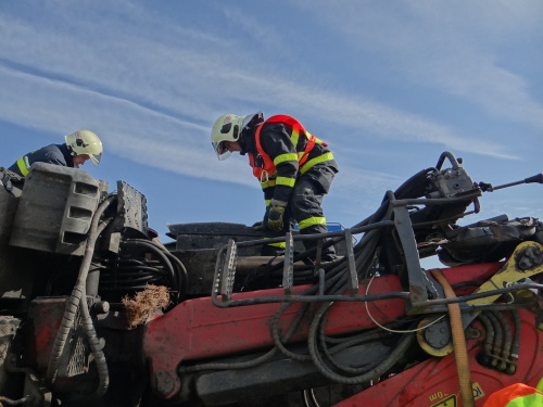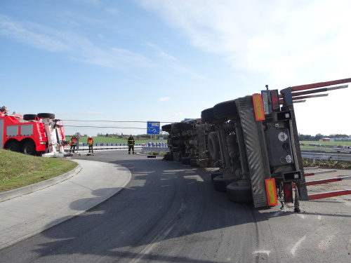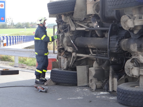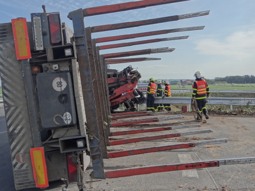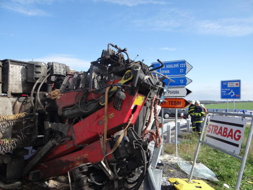 Dvě jednotky profesionálních hasičů z HZS MSK zasahovaly ve čtvrtek 7.9.2017 ráno a dopoledne na kruhovém objezdu prodloužené Rudné mezi ostravskými částmi Poruba a Krásné Pole u nehody kamionu Tatra, který vezl těžké kmeny. Kamion skončil i s přívěsem na pravém boku ve svodidlech, jeho řidič se zranil a skončil v nemocnici. Hasiči museli po vyložení nákladu kamion postavit zpět na kola Bizonem.
