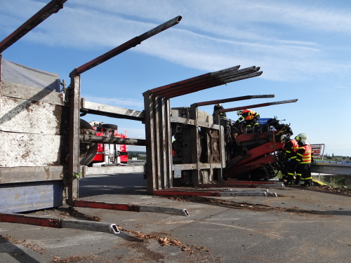 Hasiči předali do péče ZZS MSK zraněného řidiče, který byl při vědomí, pak počkaly na přeložení nákladu těžkých kmenů na náhradní vozidlo soukromou firmou. Prázdný kamion i s přívěsem postavili hasiči zpět na kola najednou pomocí zadních navijáků Bizona, když museli hydraulickými nůžkami upravit část překážejících svodidel. Silniční doprava nemusela být při vyprošťování zastavena.