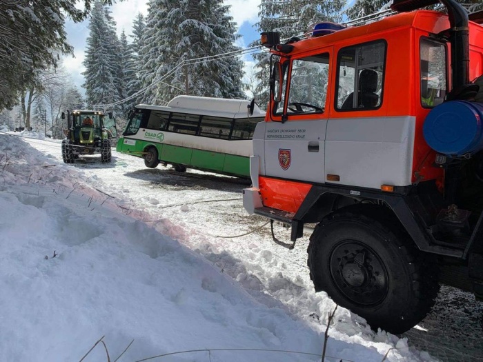 Na dvou místech Moravskoslezského kraje vyprošťovali profesionální hasiči (HZS MSK) během čtvrtečního dopoledne 18.3.2021 linkové autobusy v souvislosti se sněhem či námrazou. První skončil v betonovém mostku v Havířově-Bludovicích a byl na něj použit automobilový jeřáb, druhý v katastru beskydské obce Krásná (okres Frýdek-Místek) v příkopu, na silnici jej vytáhl vyprošťovací automobil Tatra 815 s asistencí traktoru. Obě nehody se obešly bez zranění.
