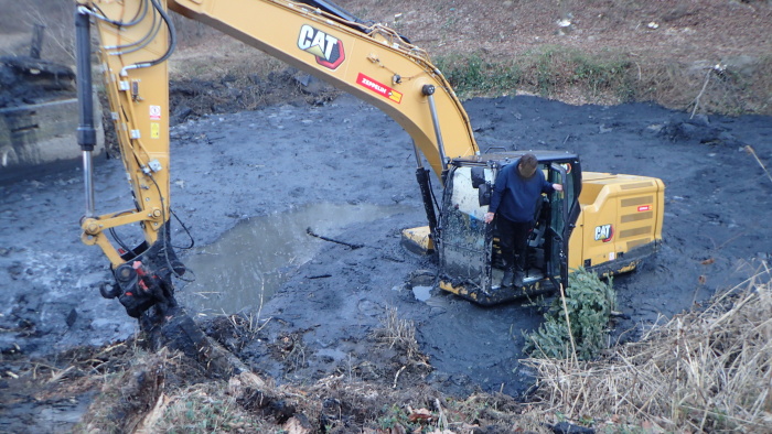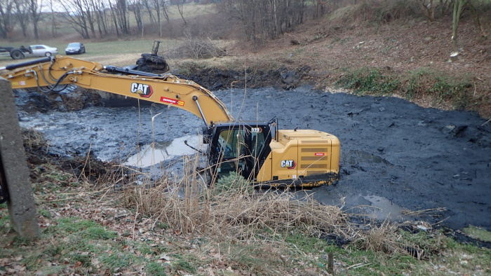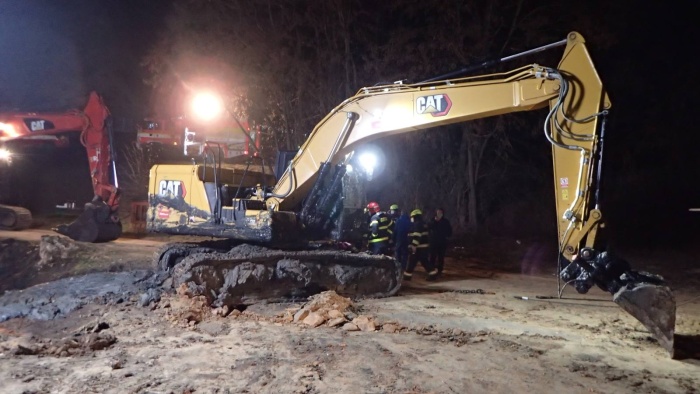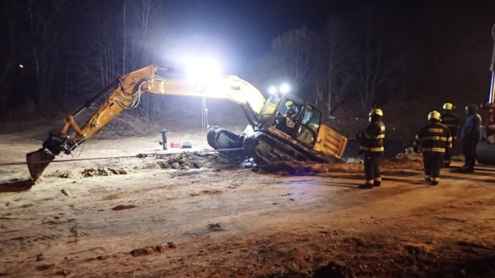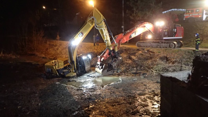 Profesionální hasiči ze stanic HZS Moravskoslezského kraje Hlučín a Opava a ze Záchranného útvaru HZS ČR Hlučín vyprošťovali v úterý 11.1.2022 večer v obci Závada na Hlučínsku (okres Opava) bagr Caterpillar, který zapadl při čistění nánosu bahna v místním rybníku.