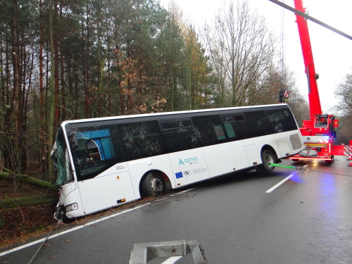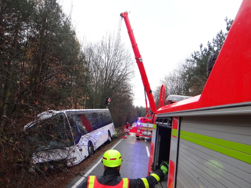 Po příjezdu speciální techniky z Opavy a Ostravy se Bizon postavil před přední část havarovaného autobusu a jistil ho pomocí lana z navijáku. Lano z druhého navijáku Bizona hasiči navázali přes strom v lese na levé zadní kolo kvůli snazšímu posunu autobusu k silnici. Jeřáb zezadu opatrně zvedal zadní část autobusu, aby se zadní kola dostala na (nad) silnici. Ve druhé fázi hasiči použili zadní naviják jeřábu a bez větších problémů položili autobus na všechna čtyři kola na silnici.