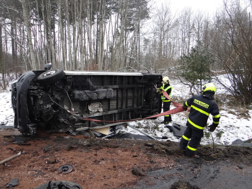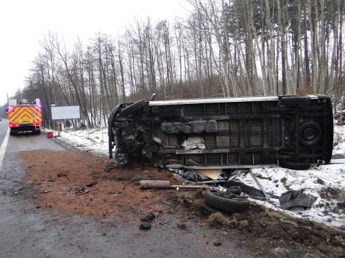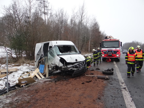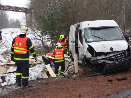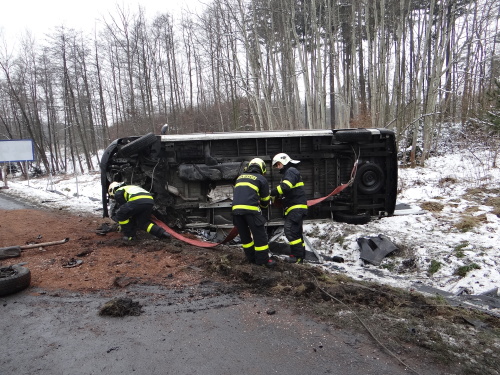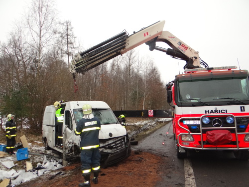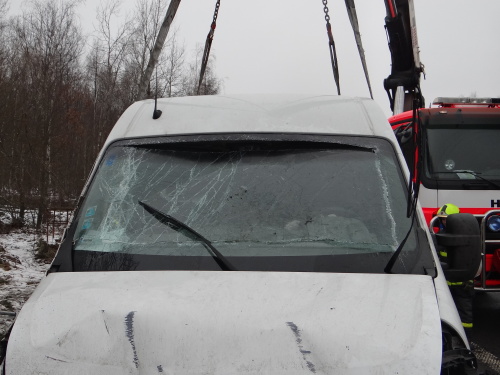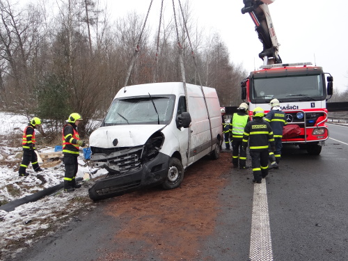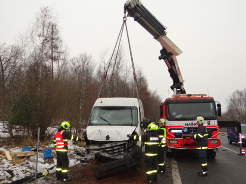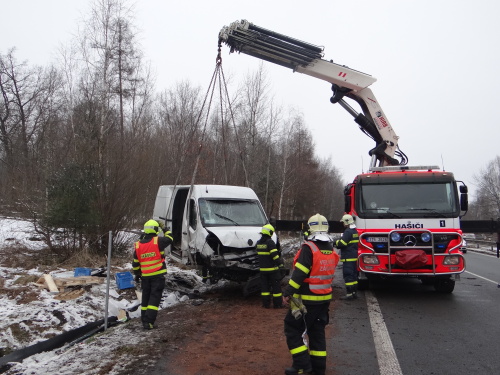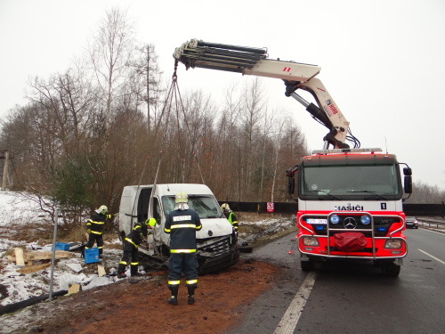 Čtyři jednotky hasičů zasahovaly v úterý 23.1.2018 na dálnici D56 u Paskova ve směru na Frýdek-Místek u nehody polského dodávkového automobilu Peugeot Boxer, který skončil na boku v příkopu mimo silnici a poškodil dálniční oplocení. Hasiči opatrně vyprostili zraněného a zaklíněného řidiče a pak pomocí Bizona i havarovanou dodávku.