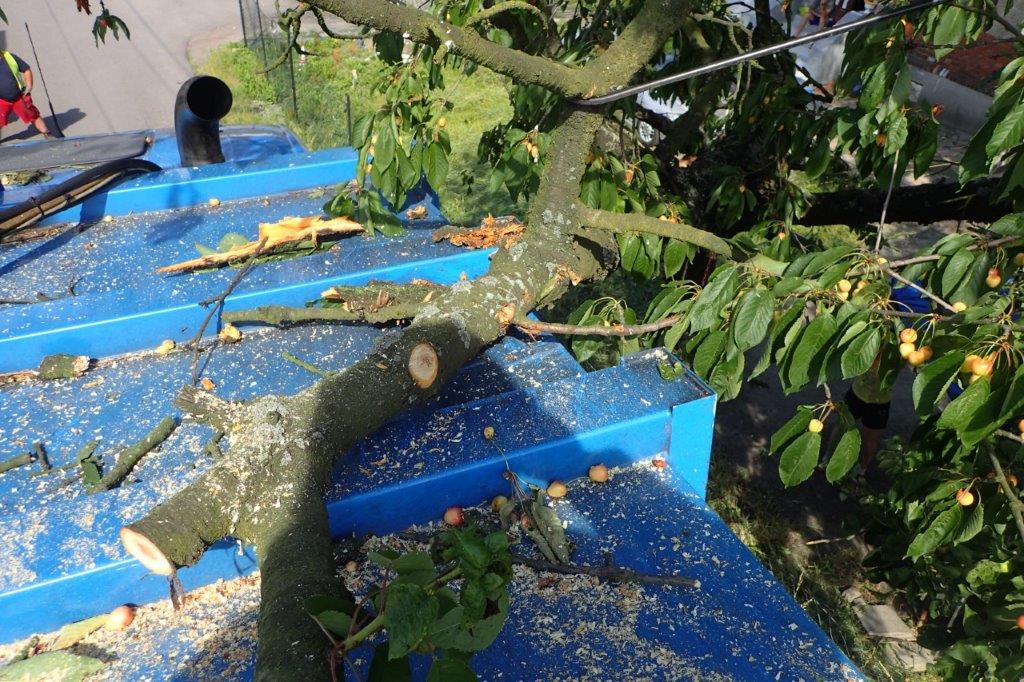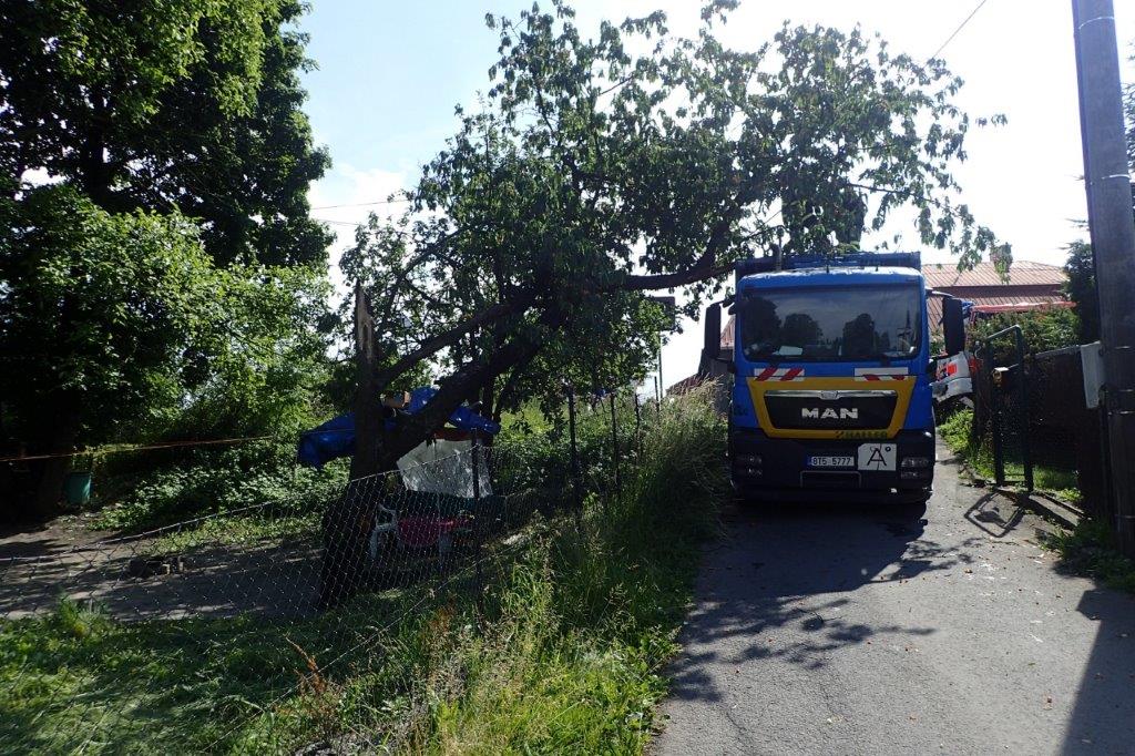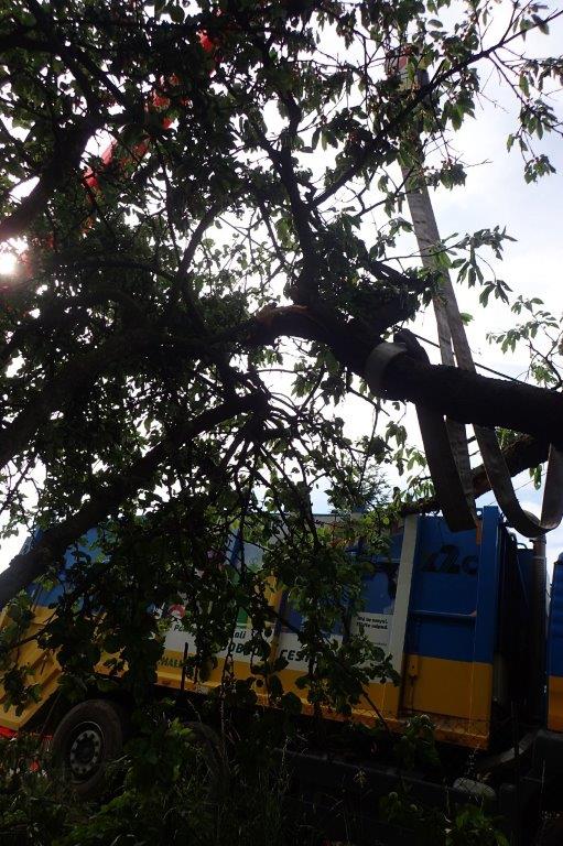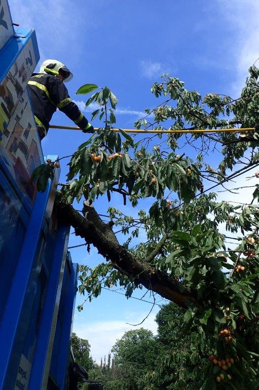 Dvě jednotky profesionálních hasičů (HZS MSK) zasahovaly ve středu 19.6.2019 odpoledne v Orlové (okres Karviná), místní části Poruba, u pádu zlomeného stromu na vozidlo pro svoz tuhého komunálního odpadu. Zásah komplikoval telefonní drát, obtočený kolem větví viditelně velmi staré třešně. K bezpečnému přidržení dřeviny během ořezávání musel přijet i automobilový jeřáb.