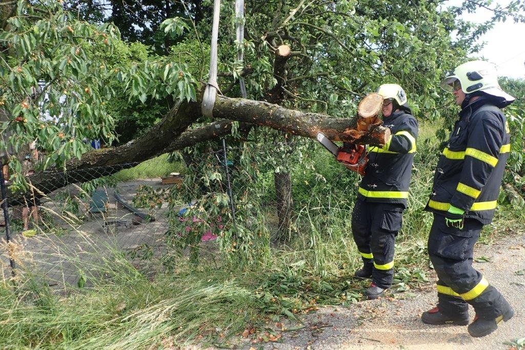 Hasiči nejprve ořezali volné větve třešně motorovou pilou a ruční pilou kvůli uvolnění telefonního drátu a možnosti strom bezpečně...