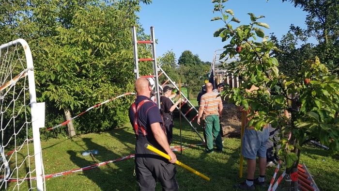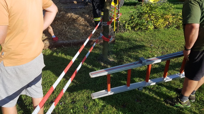 Chovatelé hasičům poradili, ať si sundají vše, co by mohlo chovnou zvěř zneklidnit, zásahové oděvy, přilby, roušky. Hasiči pak vybudovali z natažených červenobílých výstražných pásek vyhrazenou cestu až k vozidlu, ke své ochraně i případnému usměrnění býčků drželi sedm nastavovacích žebříků. Operace se ve spolupráci s chovateli nakonec podařila bez zranění, zahrada osiřela, zbylo jen několik kravinců k pohnojení…
