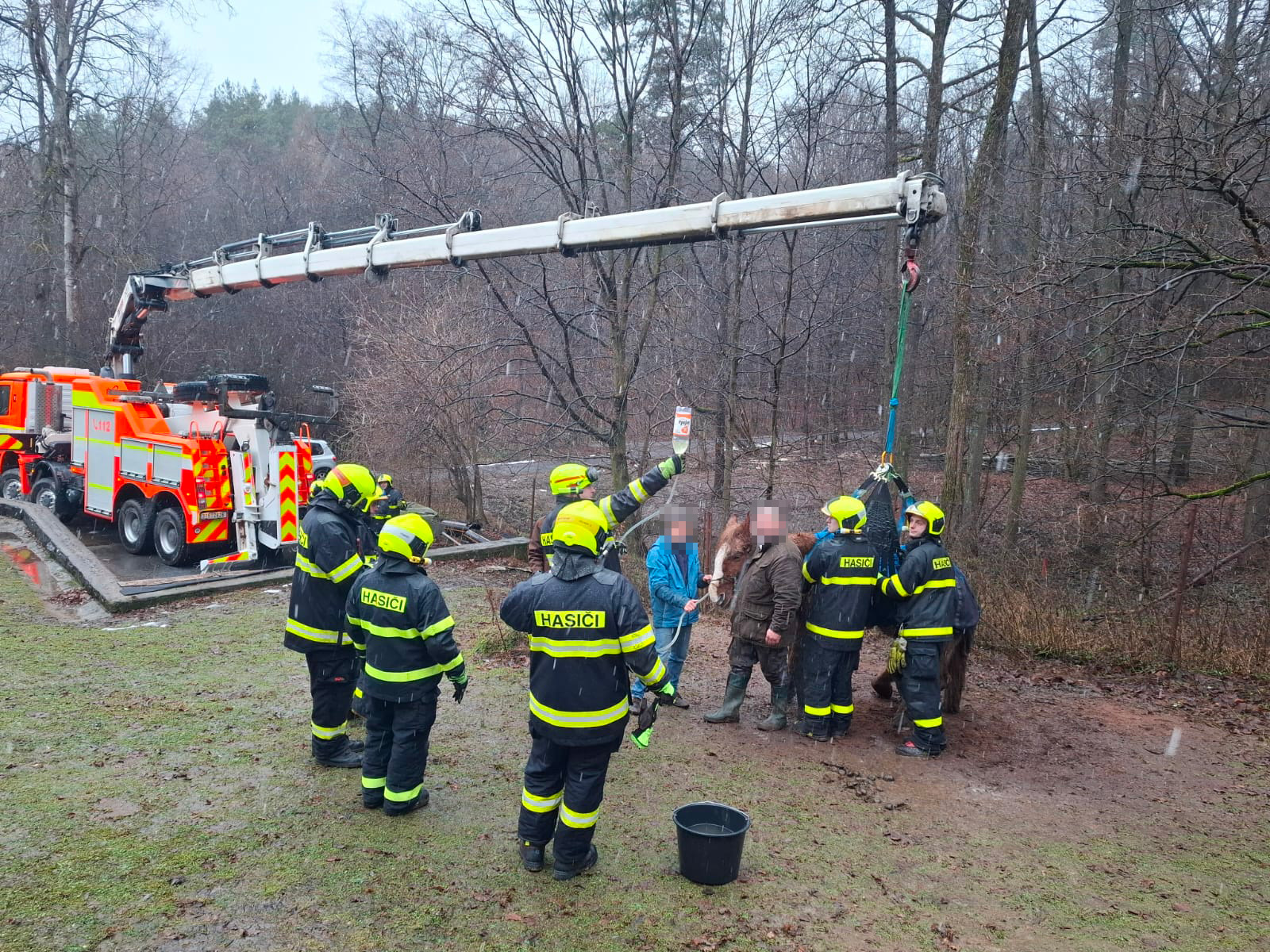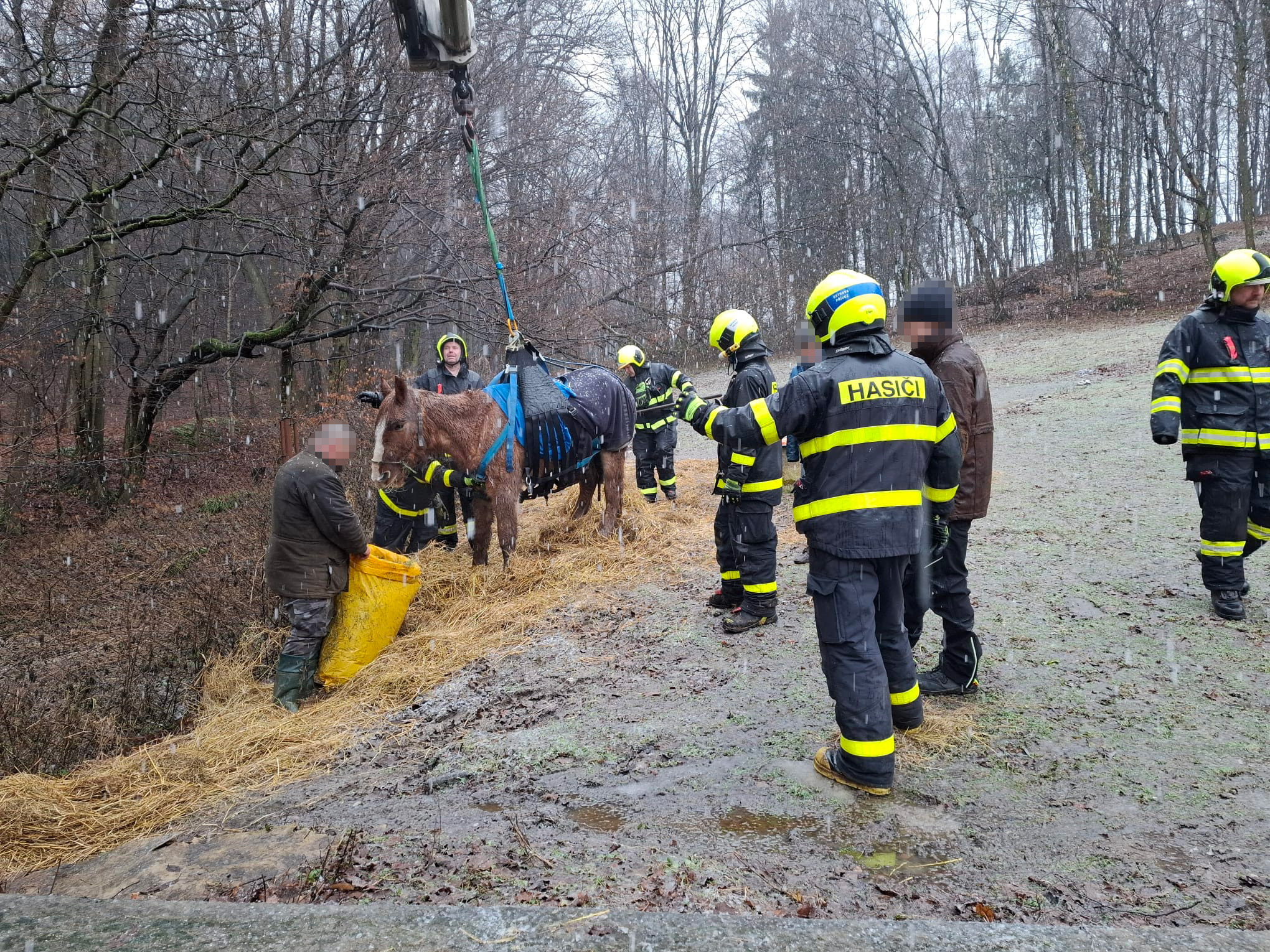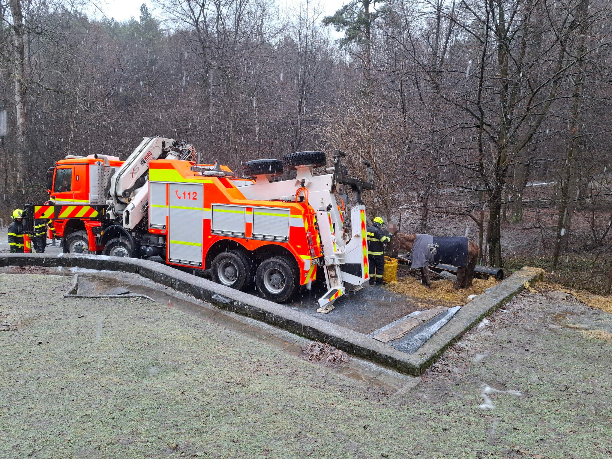 Kobyla upadla na svažitém zamrzlém terénu a nebyla schopna sama vstát. Do akce přijela těžká technika.