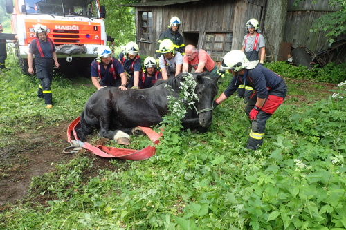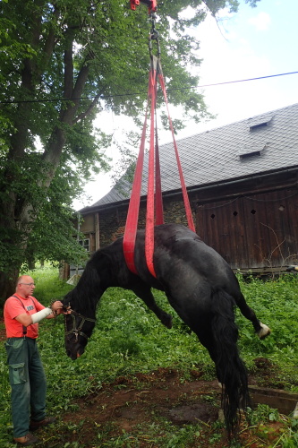 Zhruba patnáctiletý kůň ležel bezvládně na zemi, levou nohu uvězněnou v betonové jímce. Hasiči v první fázi použili pro jeho úlevu a vytvoření místa pro podvlečení nafukovací zvedací vaky. Po dojezdu vyprošťovacího speciálu se jim podařilo podvléci nebohému zvířeti široké popruhy pod břichem a opatrně jej začali zvedat pomocí hydraulické ruky speciálu. Majitel jej držel za hlavu a uklidňoval.