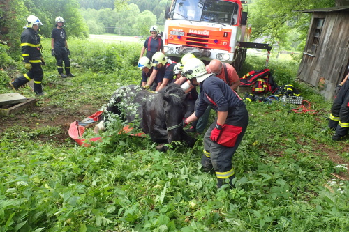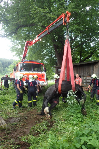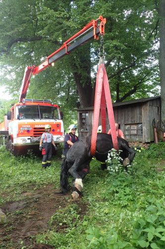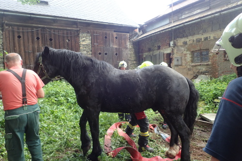 Dvě jednotky hasičů se zapojily během nedělního dopoledne 11.6.2017 do záchrany staršího koně, který si na statku ve Světlé Hoře (okres Bruntál) zaklesl levou zadní nohu v betonové jímce a nemohl s ní ven. Hasiči jej nejprve nadlehčili zvedacími vaky a pak jej zvedli hasičským vyprošťovacím speciálem z Bruntálu. Celý zásah trval asi hodinu.
