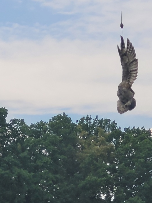 Krásnou sovu zřejmě během pondělního dne rybáři vyrušili při spánku na některé větvi, a ten se při střemhlavém úniku nešťastně zamotal do rybářského vlasce s háčkem a závažím, který někdy dříve zanechal v koruně stromu nad rybníkem jeden z jejich méně šikovných kolegů. Nejméně několik desítek minut tak bezvládně visel za křídlo asi pět metrů nad hladinou a stejnou vzdálenost (tedy pět metrů) od nejbližšího břehu.
