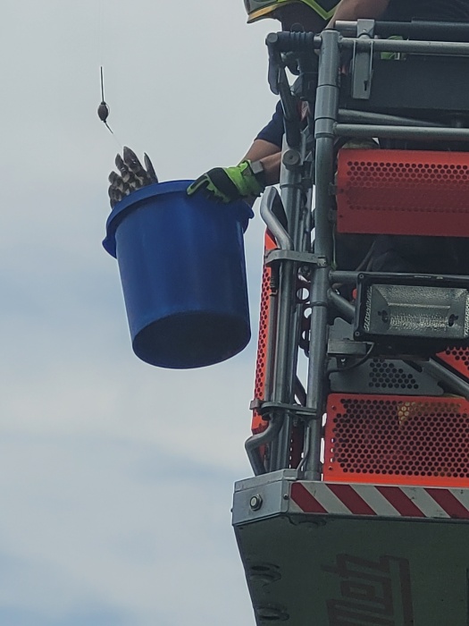 Hasič v koši výsuvného žebříku opatrně položil puštíka do plastového kbelíku a kolegové jej dole ještě zbavili zbytku rybářských propriet. Naprosto vysílená sova byla krotká a odevzdaná.