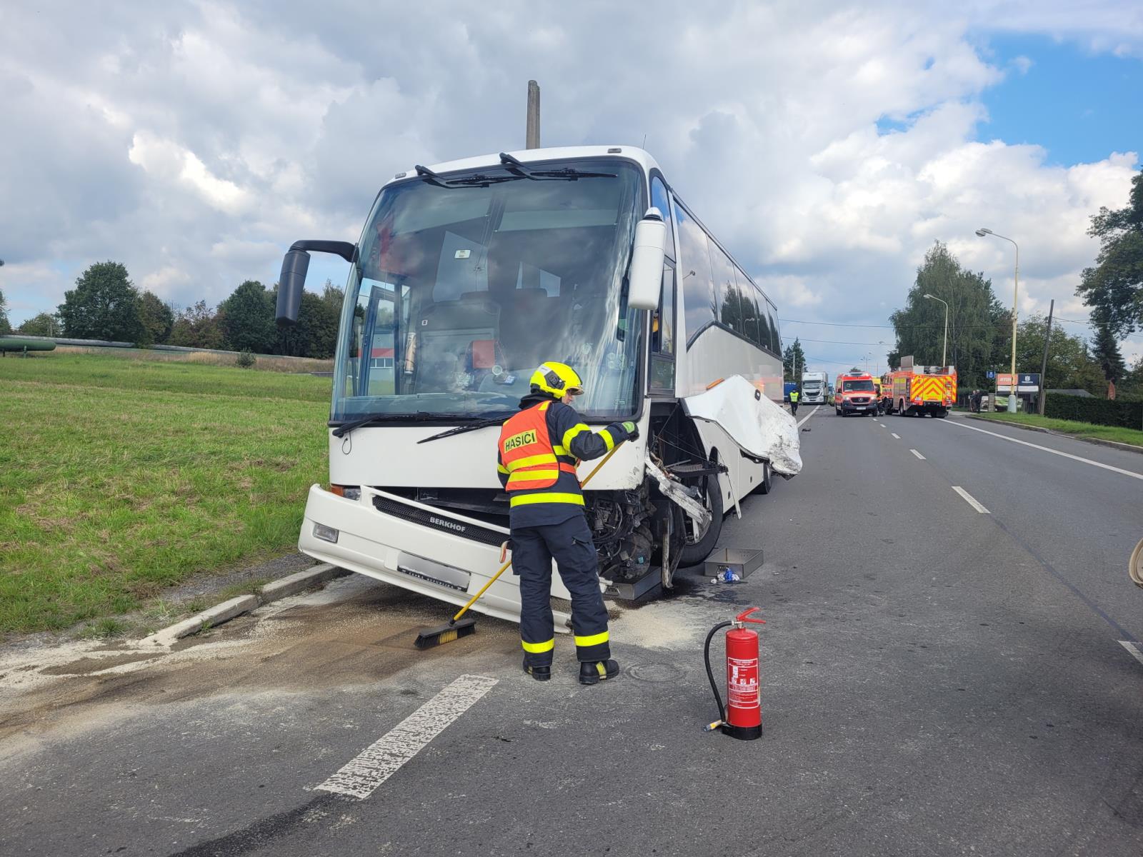 Po příjezdu na místo hasiči zajistili všechna vozidla proti požáru. Z havarovaného autobusu docházelo k úniku nafty z proražené nádrže. Hasiči proto nádrž provizorně utěsnili speciálním tmelem. Zbylou naftu v nádrži hasiči přečerpali, pomocí čerpadla z chemického automobilu, do přistaveného náhradního autobusu, který přijel pro všechny děti a jejich doprovod. Vyteklou naftu na komunikaci hasiči zasypali sorbentem.