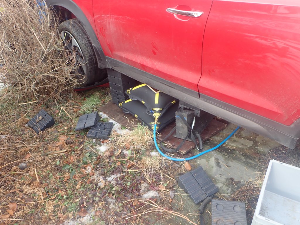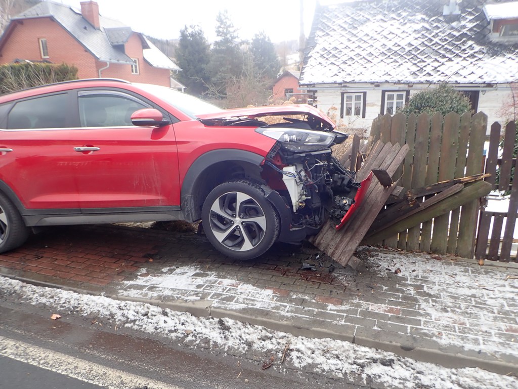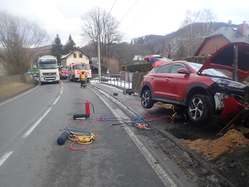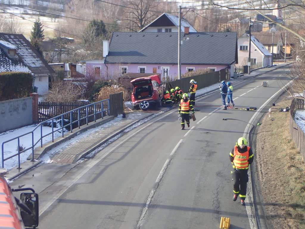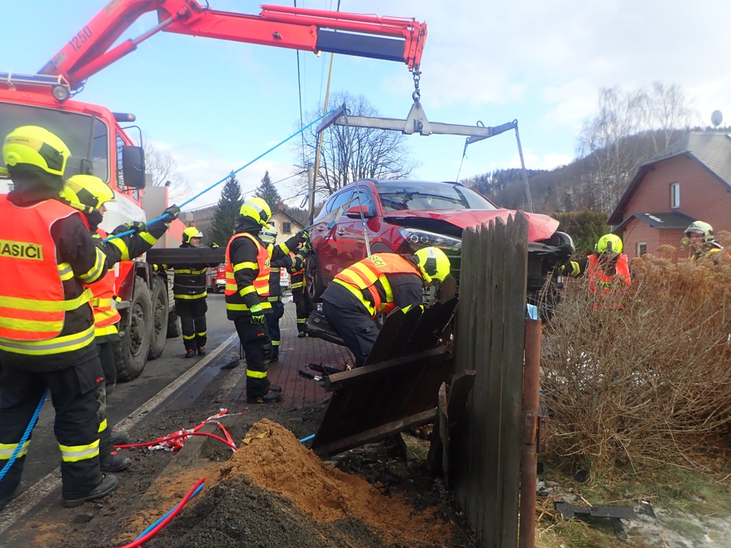 Až po poledni tak mohli hasiči sundat havarované osobní auto z plotu a plynové přípojky (HUP) pomocí hydraulické ruky vyprošťovacího speciálu Tatra 815 z bruntálské stanice HZS MSK.