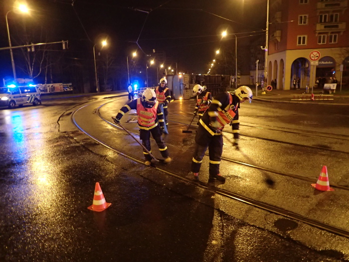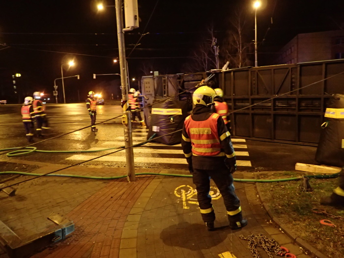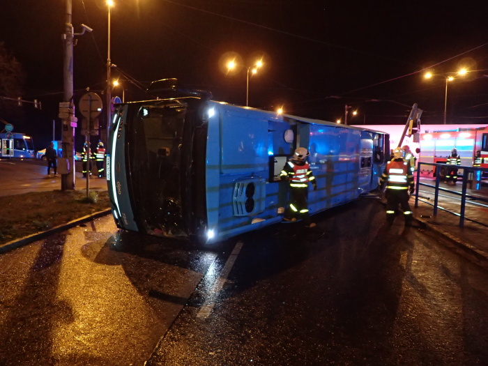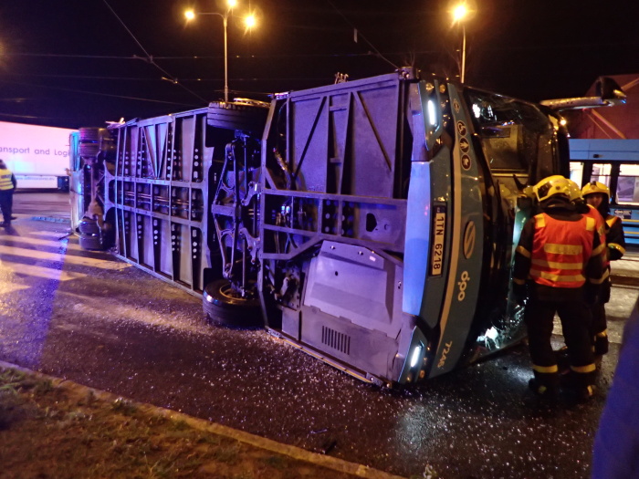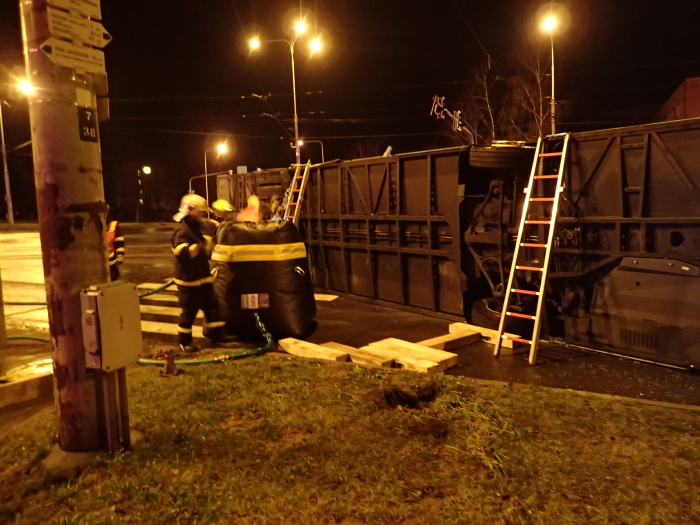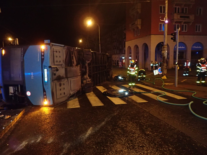 Hasiči zvedali v noci na kola autobus na křižovatce v Ostravě-Porubě