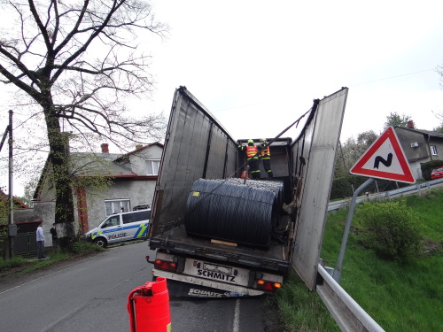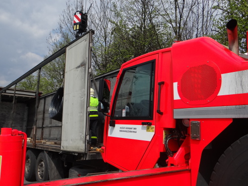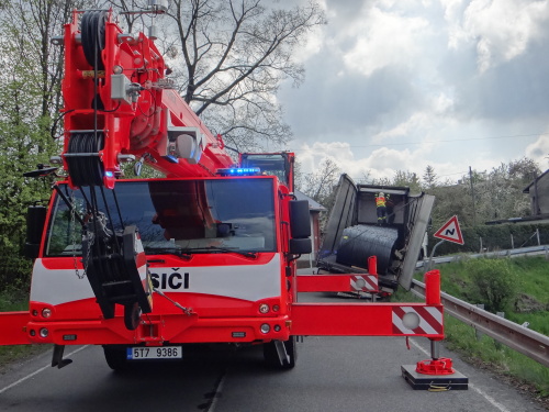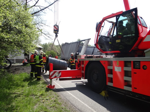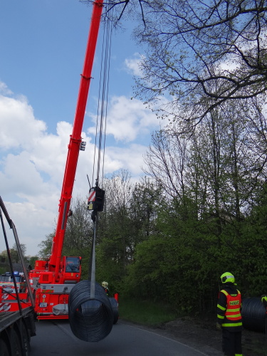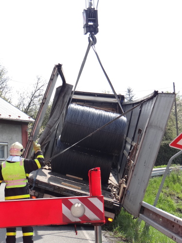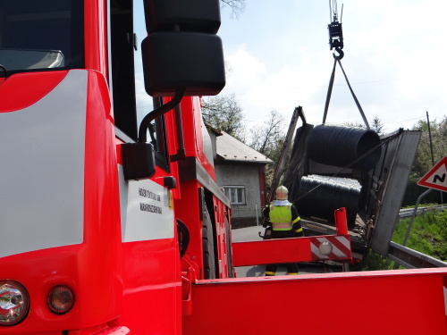 Hasičský jeřáb vyprostil v Bohumíně kamion a překládal jeho drátěný náklad