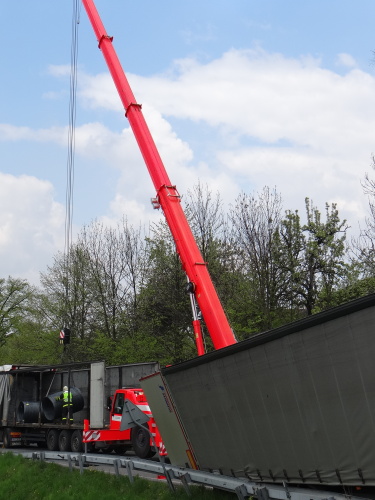 Dvě jednotky profesionálních hasičů (HZS MSK) zasahovaly v sobotu 29.4.2017 kolem poledne v Bohumíně-Záblatí (okres Karviná) u nehody kamionu DAF s nákladem 22 tun drátu smotaných do 11 dvoutunových válců na návěsu, který skončil pravými koly v měkké půdě zapasovaný ve svodidlech. Hlavní slovo měl při vykládce těžkých drátěných válců a pak i při úspěšném vyprošťování DAFu hasičský jeřáb Demag/Terex, pomáhal mu naviják hasičské cisterny.