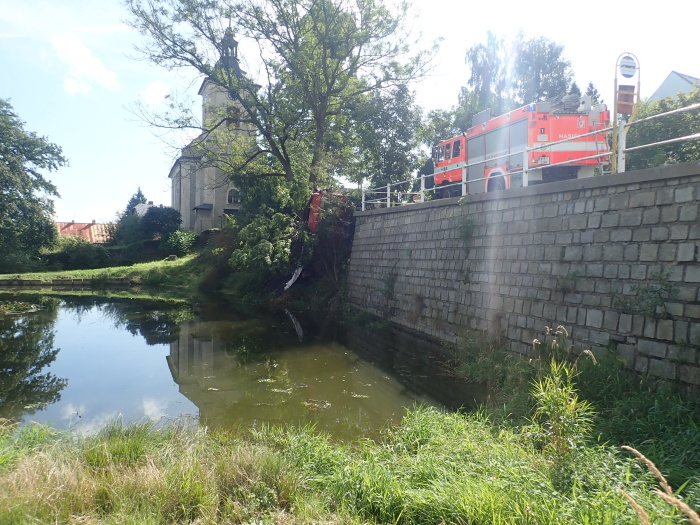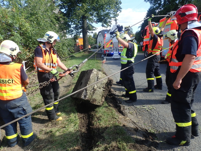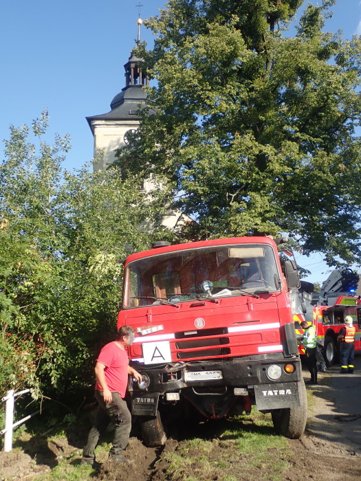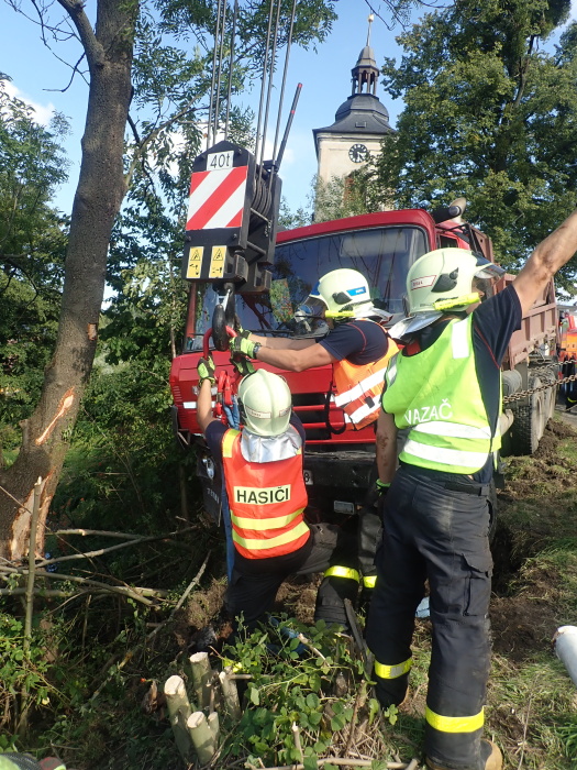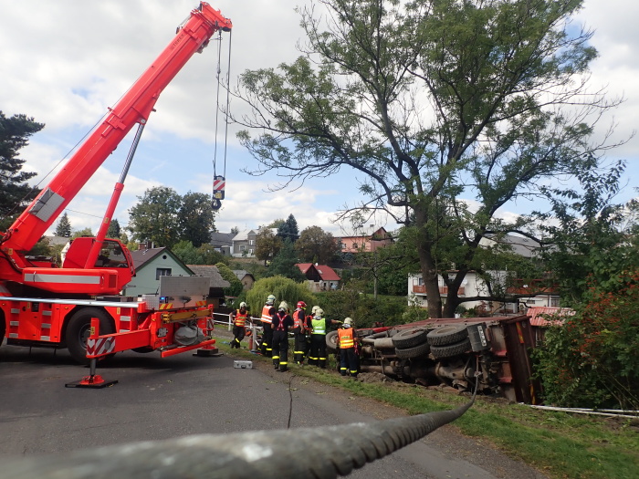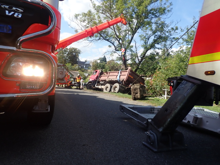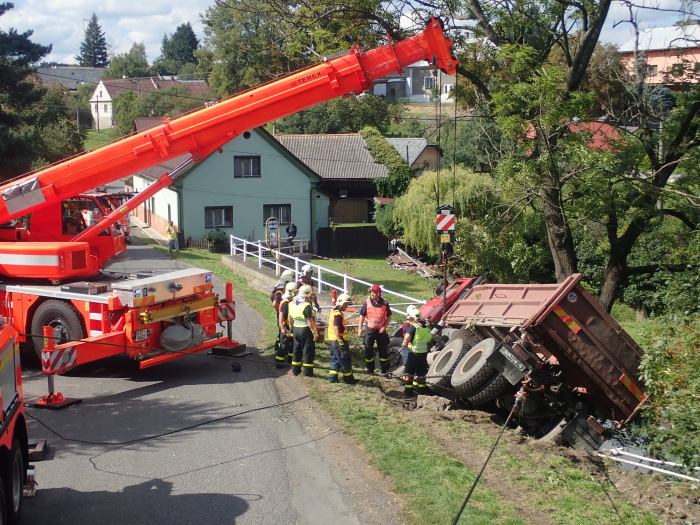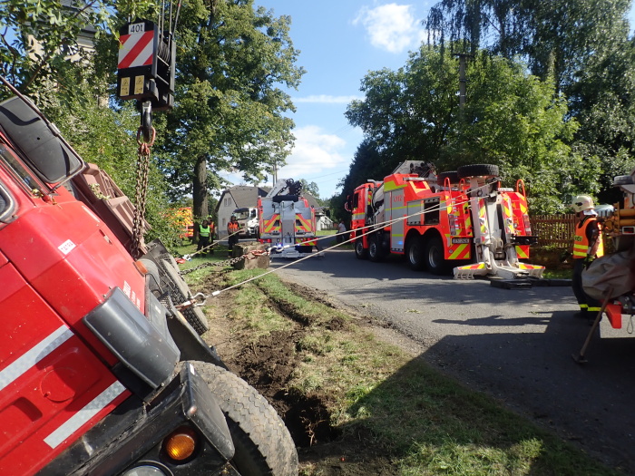 Hned tři speciální hasičská vozidla – automobilový jeřáb Terex/Demag z Opavy a dva vyprošťovací speciály MB Actros Bizon a Tatra 815 Omars z Ostravy – musela ve středu 11.9.2019 odpoledne vytahovat v Jakartovicích (okres Opava) nebezpečný nákladní automobil s asfaltovou obalovanou směsí, bezmocně visící nad požární nádrží a držený pouze mohutným stromem. Hrozil pád těžkého vozidla do vody a únik nafty z palivové nádrže do půdy a vody.