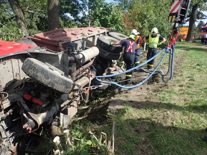 Po několika postupných krocích byl nákladní automobil zpět na silnici na kolech. Asi polovina nákladu asfaltové směsi, určené pro výstavbu či opravu silnice, skončila v požární nádrži. Odtěžení a následný úklid je již povinností majitele úspěšně vyproštěného vozidla.