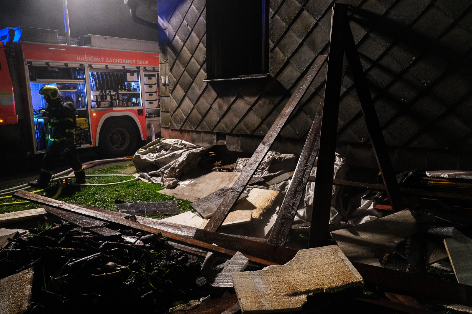 Plameny se z hořící poloviny domu začaly šířit i na střechu objektu, vnitřní prostor byl požárem zcela zasažen.