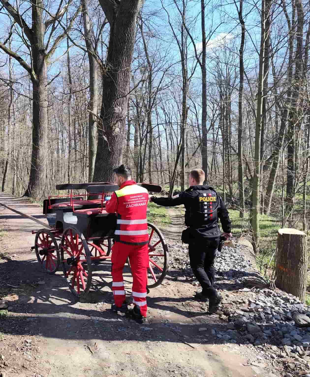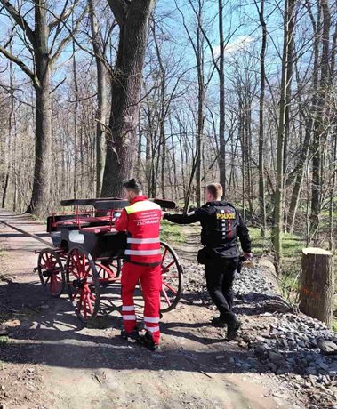 Krátce po půl jedenácté přijali dispečeři linky 155 hlášení o muži zraněném při jízdě na povozu poblíž Štáblovic. Jednašedesátiletý muž jel po lesní cestě, když se kůň splašil a povoz sjel do příkopy. Muž upadl a několik minut byl v bezvědomí. Záchranáři mu poskytli přednemocniční péči, zjistili otřes mozku, poranění horní končetiny a odřeniny. Pacienta následně transportovali do nemocnice v Opavě, kde pokračovala péče v chirurgické ambulanci.
