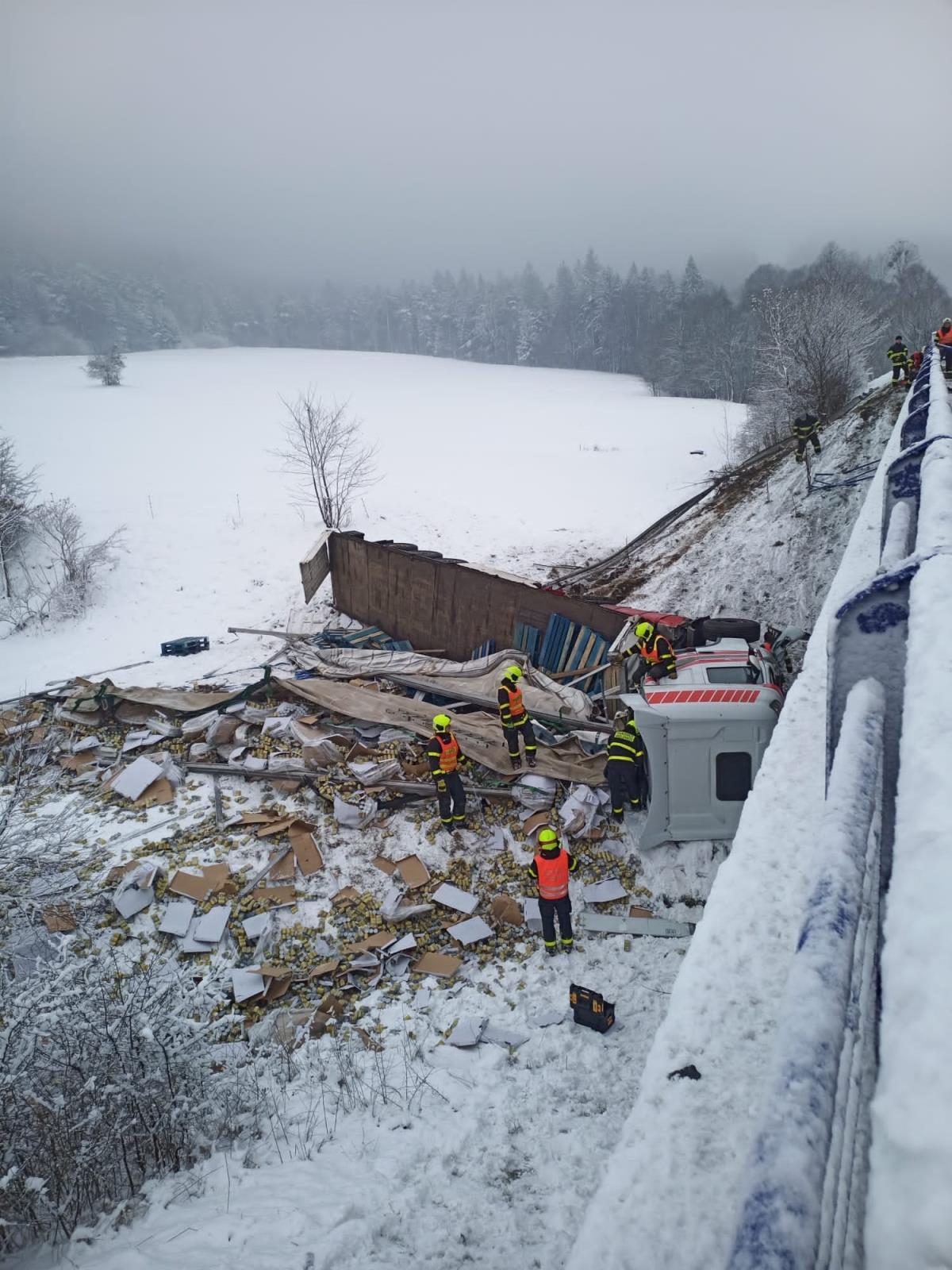 Krátce před sedmou hodinou ranní prorazil, před mostem na silnici I/11 v katastru obce Mosty u Jablunkova, svodidla kamion, který sjel ze silnice, kde se převrátil. Na místě v jednu chvíli zasahovalo celkem pět jednotek hasičů. Z kamionu vyteklo větší množství nafty, kterou musela soukromá firma z půdy sanovat. Vzhledem k náledí byla, z důvodu bezpečí zasahujících hasičů, silnice vedoucí ze Slovenska na 30 minut uzavřena.