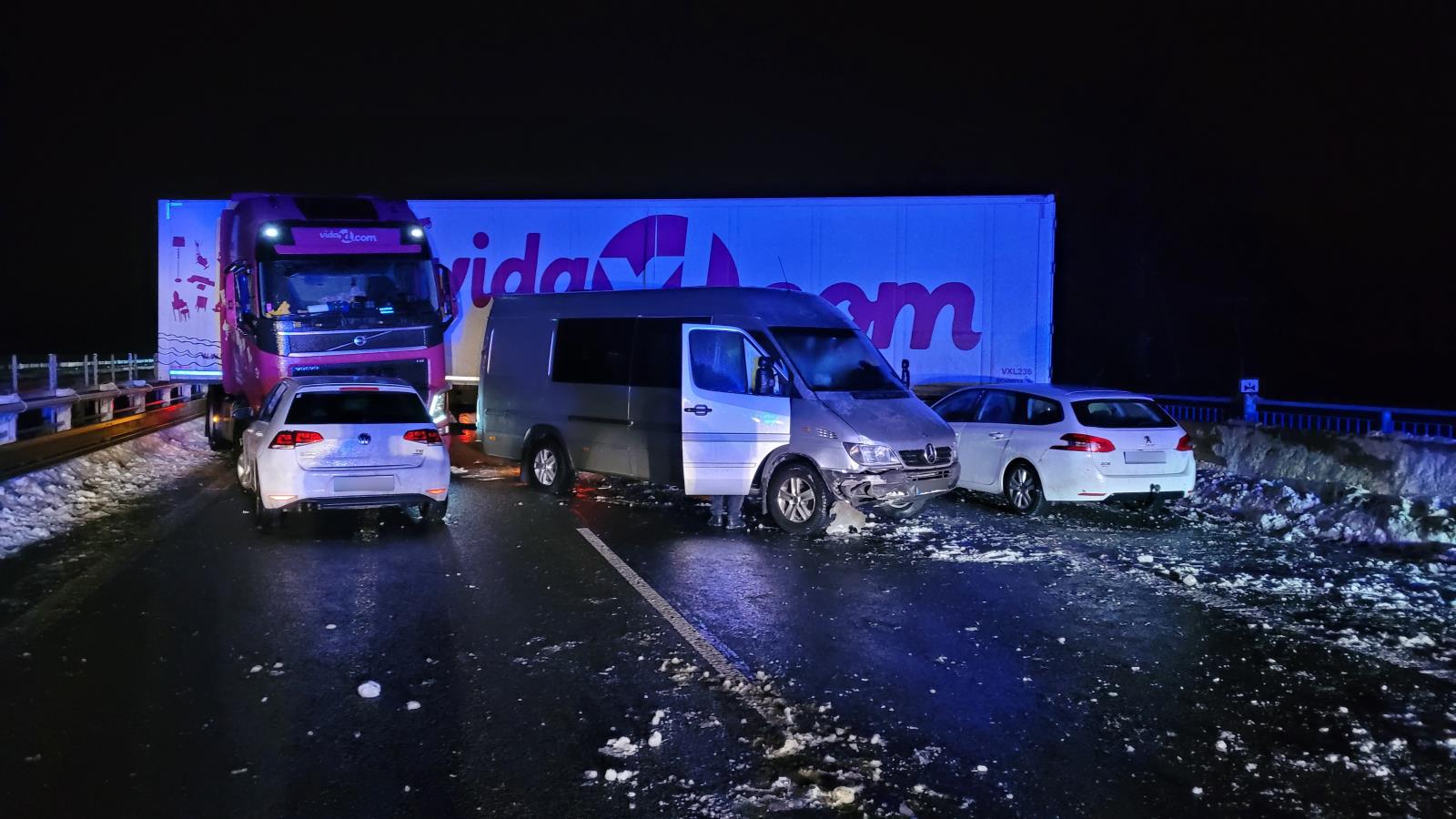 Na hasiče po příjezdu na místo události čekal kamion, který kompletně blokoval dopravu ve směru na Ostravu, spolu s ním havarovaná dvě osobní vozidla a jedna dodávka. Celkem ve vozidlech cestovalo 12 osob. Čtyři osoby utrpěly lehké oděrky, které na místě ošetřila záchranná služba.