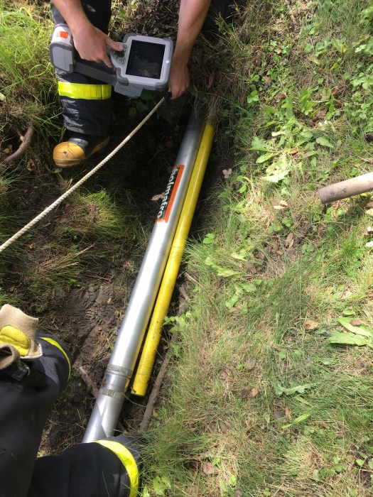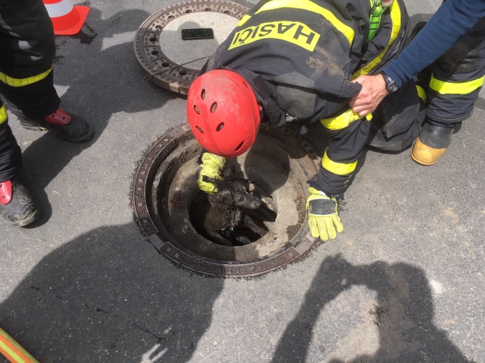Řešení ale našli: Blíž ke svislé kanálové vpusti jej pomalu posunovali nejprve nastavovacími stojkami Holmatro, pak i pomocí savice (která byla širší než stojky), zapůjčené vodárenskou společností. Pejsek nakonec hasičům pomohl sám, když se posunul posledních několik centimetrů plastovým vývodem až do kanálové vpusti, i když mu z vodorovné roury čouhala pouze hlava.