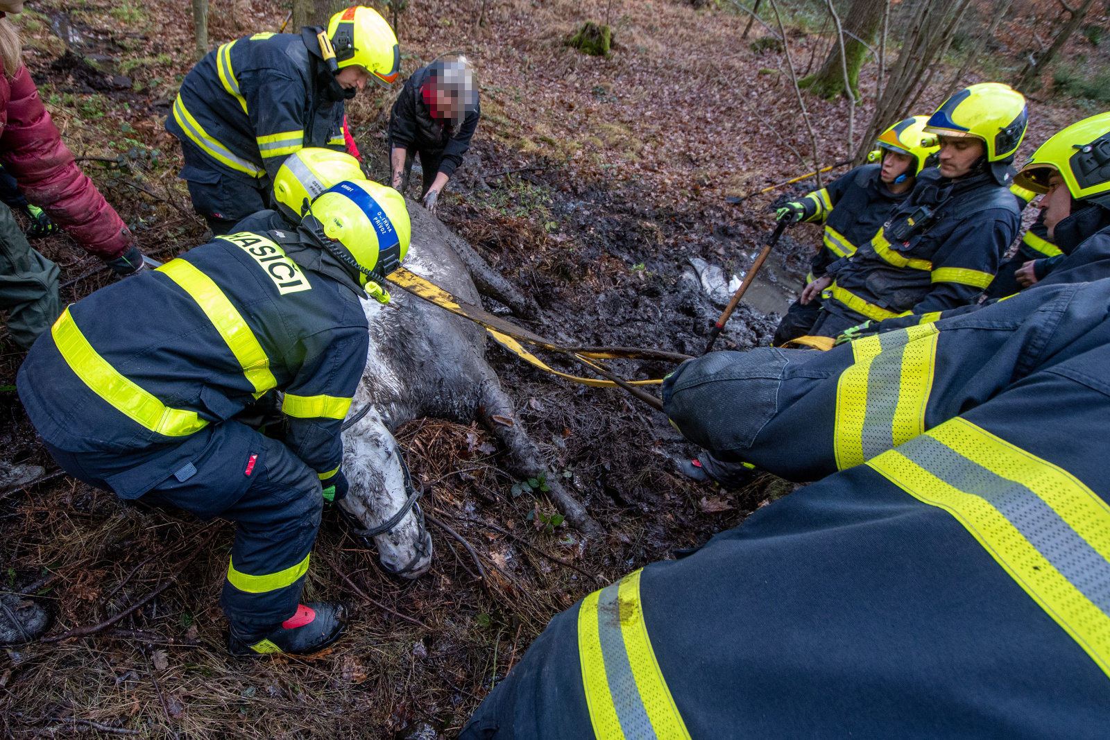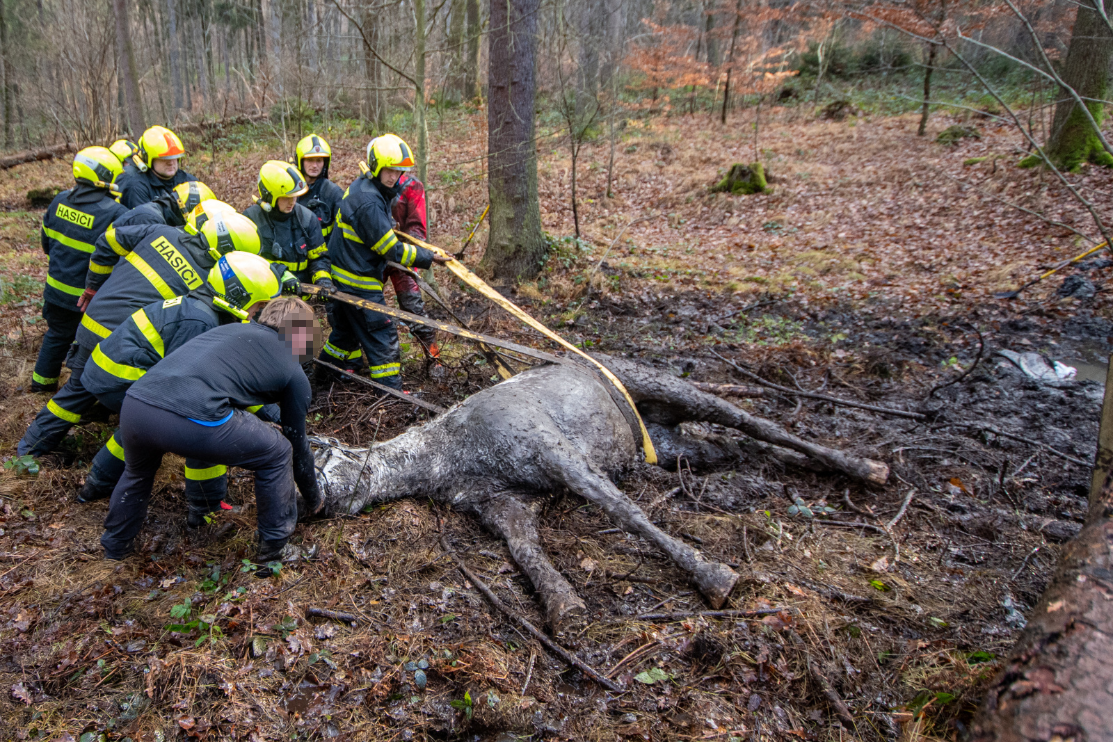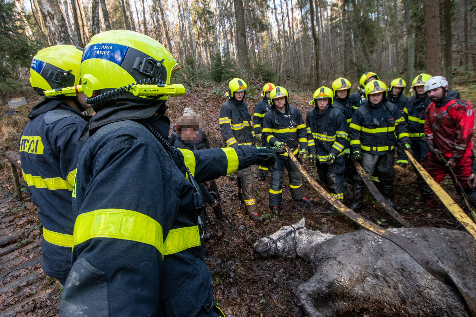 Tři jednotky hasičů zachraňovaly, v sobotu 7.12.2024, koně z bažiny ve Frýdeckém lese.