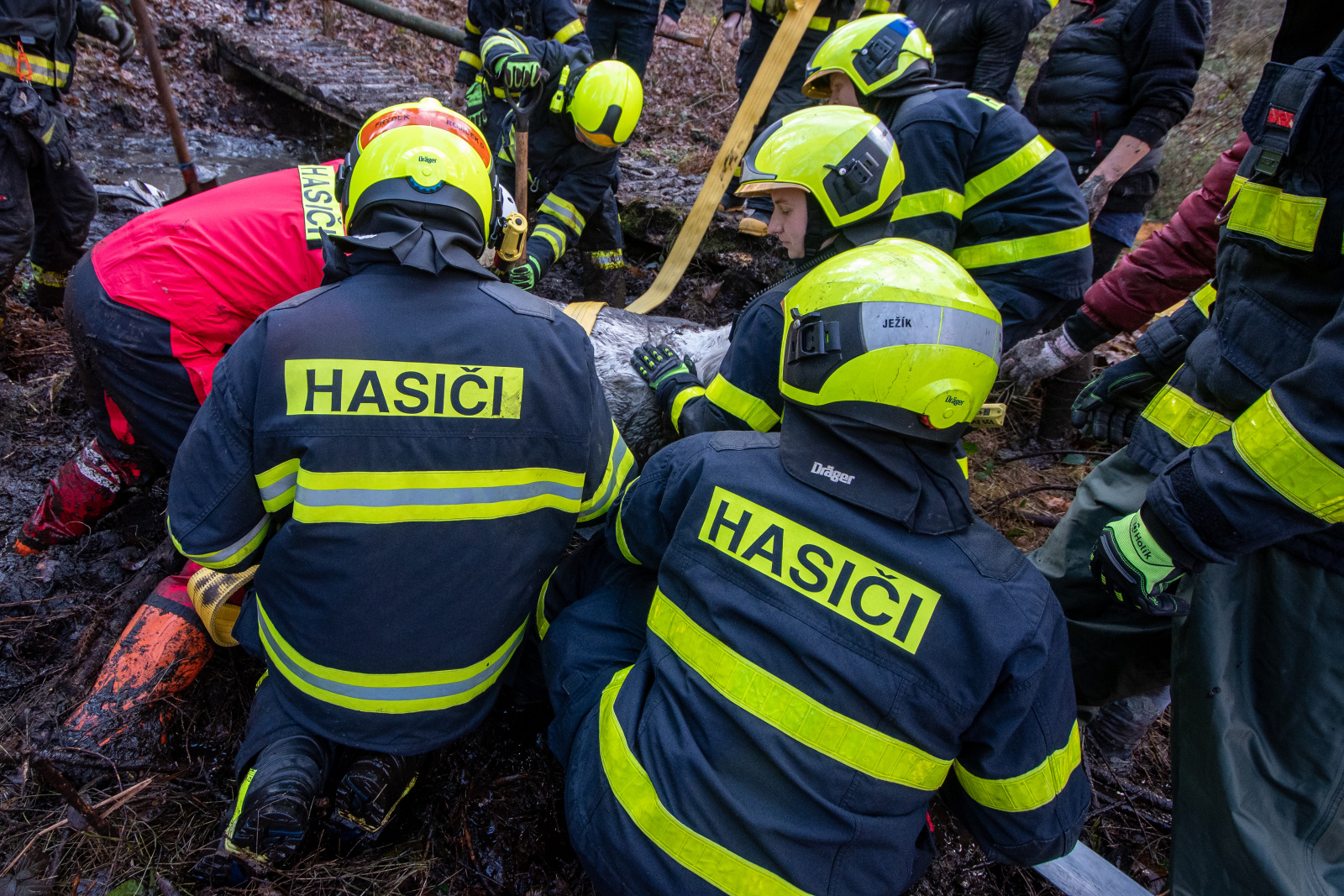 Je i video. Informaci o potřebě záchrany koně, jenž se vlivem prasknutí latě dřevěného chodníku lekl a spadl do přilehlé bažiny...