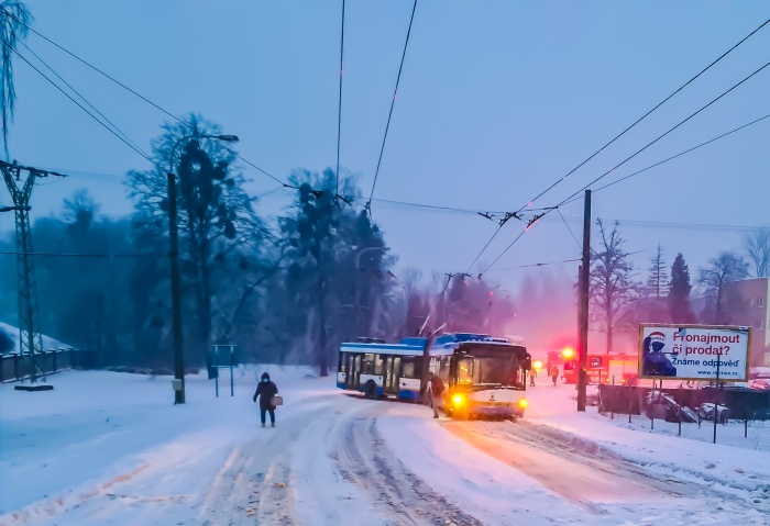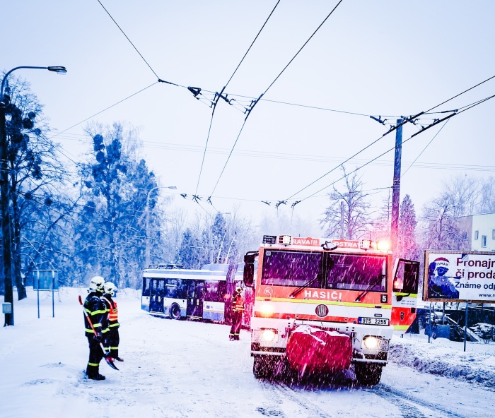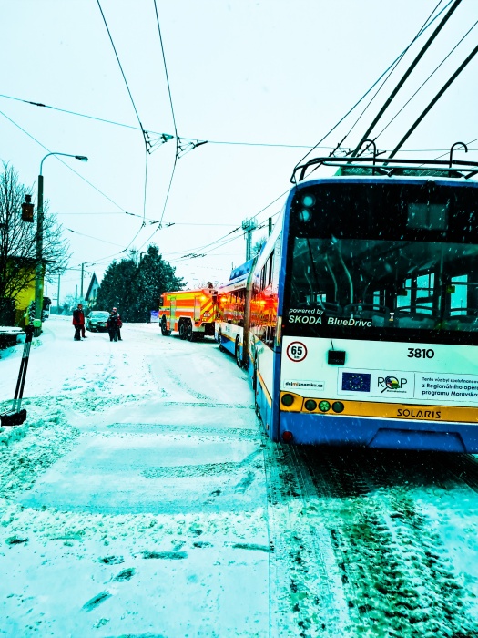 V Ostravě se pokoušel již prázdný kloubový trolejbus vyjet zasněžený kopec v ulici Československé armády nedaleko stanice HZS Moravskoslezského kraje Slezská Ostrava. Při couvání, aby měl při dalším pokusu lepší rozjezd, se na silnici zasekl a lehce „zlomil“ v kloubu. Profesionální hasiči ze Slezské Ostravy před trolejbusem lopatami odházeli čerstvý sníh. Pak jej zapřáhli za silnou cisternovou automobilovou stříkačku Tatra a ta jej odtáhla na rovný úsek silnice.