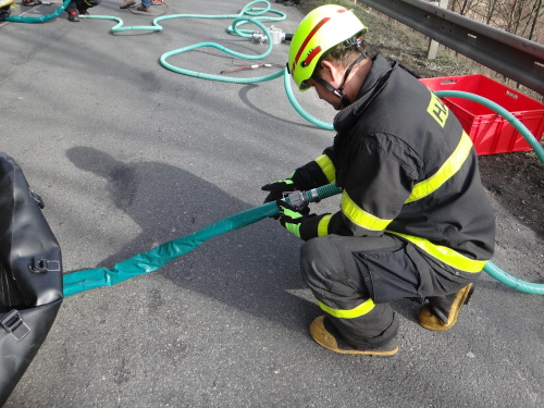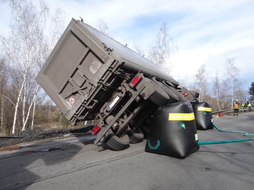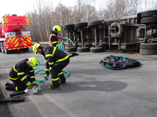 Dvě jednotky profesionálních hasičů (HZS MSK) zasahovaly v pondělí 4.3.2019 odpoledne v obci Staříč (okres Frýdek-Místek) u nehody nákladního automobilu Volvo, který převážel hlušinu. Vozidlo skončilo ve svodidlech u mostu přes dálnici D56 na levém boku. Hasiči jej vyprošťovali pomocí zadních navijáků speciálu MB Actros Bizon - poprvé v Moravskoslezském kraji i s využitím dvou nafukovacích zachytávačích vaků, které mj. zásadně zmírnily dopad těžkého vozidla zpět na kola.