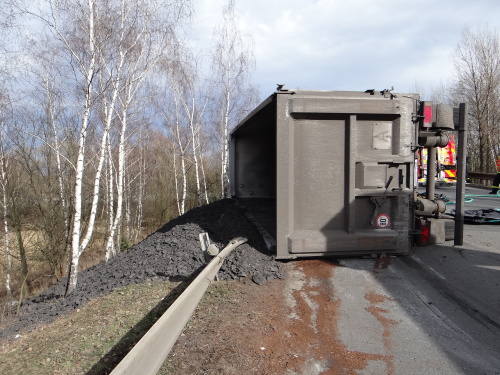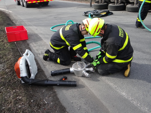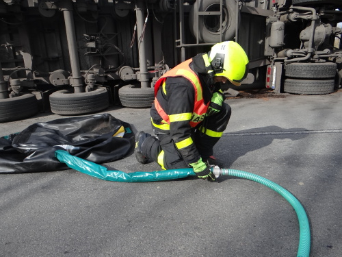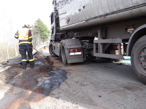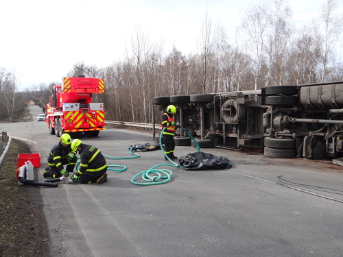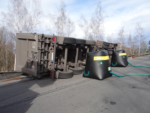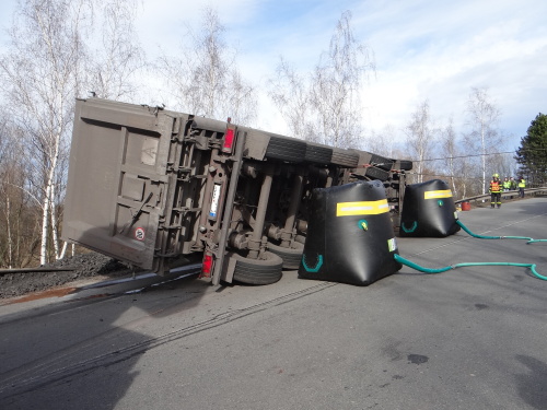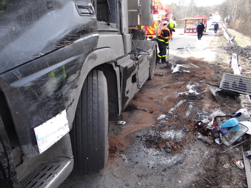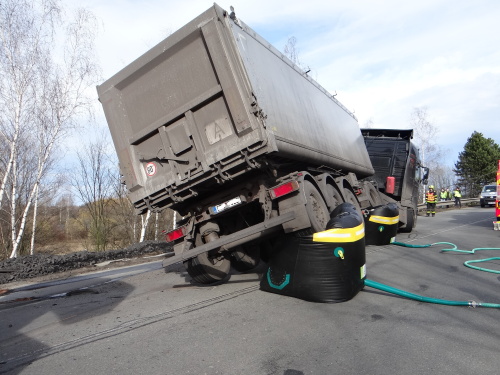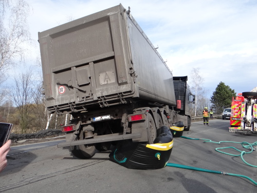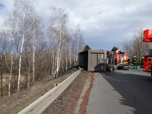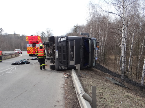 Nehoda s méně závažným zraněním řidiče se stala už v pondělí dopoledne, kdy hasiči mj. zasypali únik provozních kapalin na silnici nasákavým sorbentem. Potom však odjeli na své základny a čekali několik hodin na přeložení hlušiny a vyprázdnění korby nákladního Volva firmou, které vozidlo patří.
