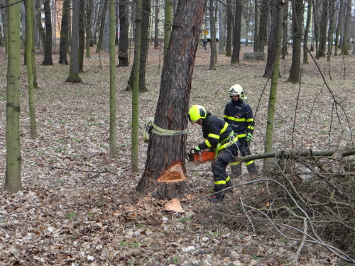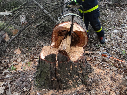 Protože kmen (na modřín poměrně široký) měl od země viditelné svislé praskliny a ještě byl částečně opřen (větvemi) o jiný strom, hasiči museli postupovat velmi opatrně. Nejprve postupným popojížděním v koši výsuvného žebříku odvětvovali motorovou pilou kmen zdola nahoru, pak pokračovali shora dolů od špičky v odřezávání nejméně metrových polen z nakloněného kmene.