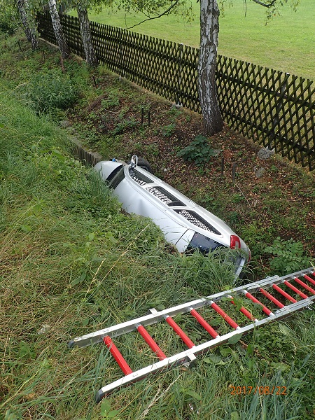 Ve Staříči, okrese Frýdek-Místek, vyprošťovali v úterý 21.srpna 2017 dopoledne moravskoslezští hasiči osobní automobil spadlý do...