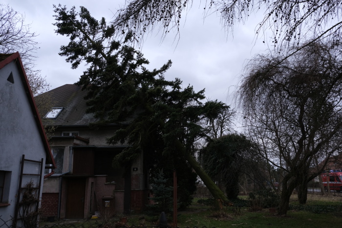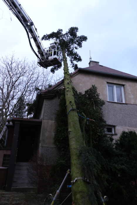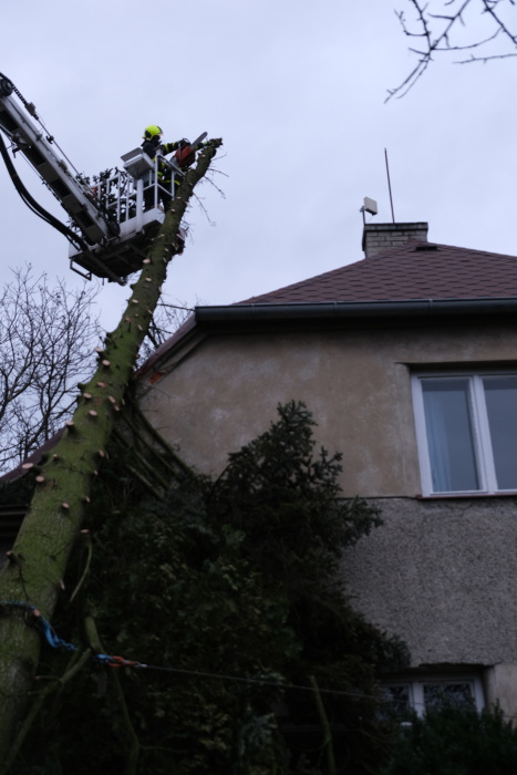 Šťastně – bez poškození zdiva a střechy – skončil nedělní odpolední pád padesátileté jedle na rodinný domek v Ostravě-Antošovicích. Hasiči z HZS MSK (stanice Ostrava-Přívoz) a dobrovolní z Koblova museli kvůli ustavení automobilové plošiny (ze stanice HZS MSK Havířov) v zahradě odřezat několik metrů pletivového plotu i s jedním sloupkem a zkrátit několik stromů a keřů. Po postupném a opatrném obřezávání stromu z plošiny motorovou pilou nakonec bezpečně – asi po hodině řezání – stáhly osekaný kmen na zem dva hasičské navijáky.