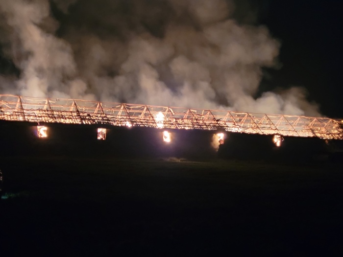 Osamocený objekt o půdorysu 100 x 10 metrů se nechává po dohodě s majitelem dohořet – pod kontrolou hasičů.