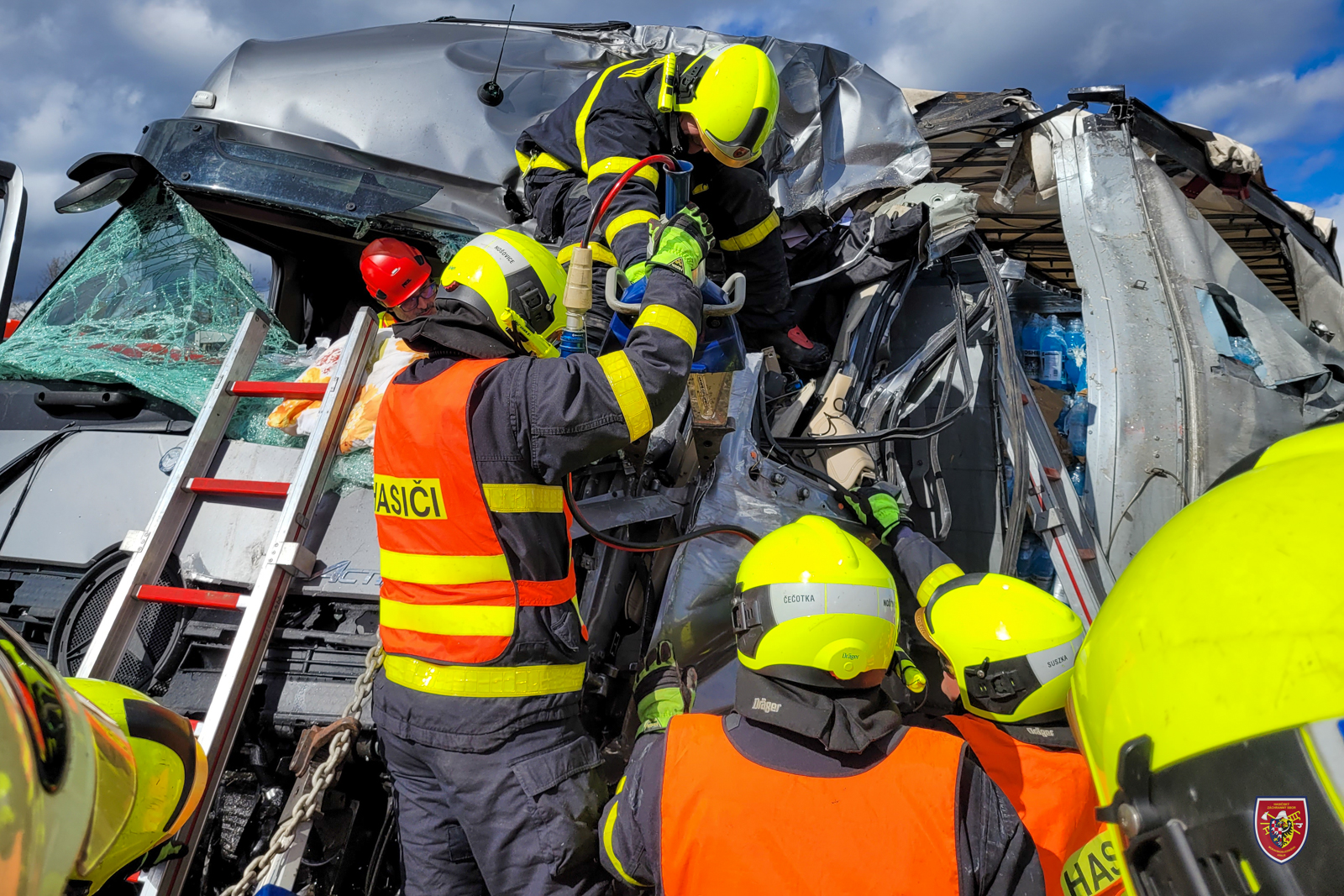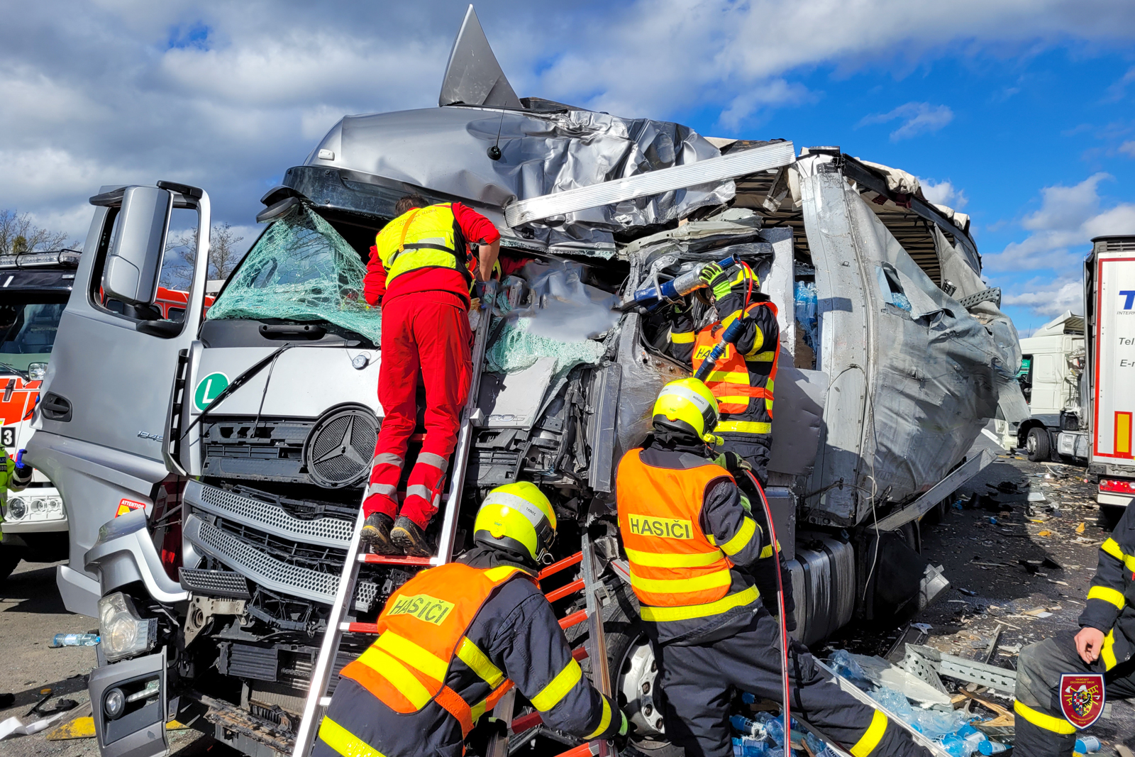 Uvnitř jednoho z kamionů zůstal zaklíněn těžce raněný řidič. Hasiči ho v úzké spolupráci se zdravotníky přibližně 15 minut vyprošťovali pomocí hydraulických nástrojů.