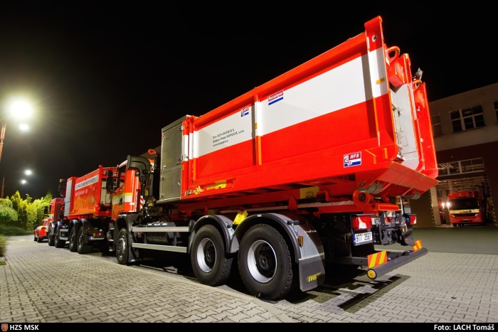 Do Ústeckého kraje dojel z Ostravy dopravní automobil, velitelský automobil a dva kontejnerové automobily, na nichž je naloženo čerpadlo Somati a tři kilometry hadic.