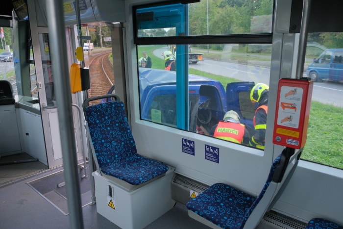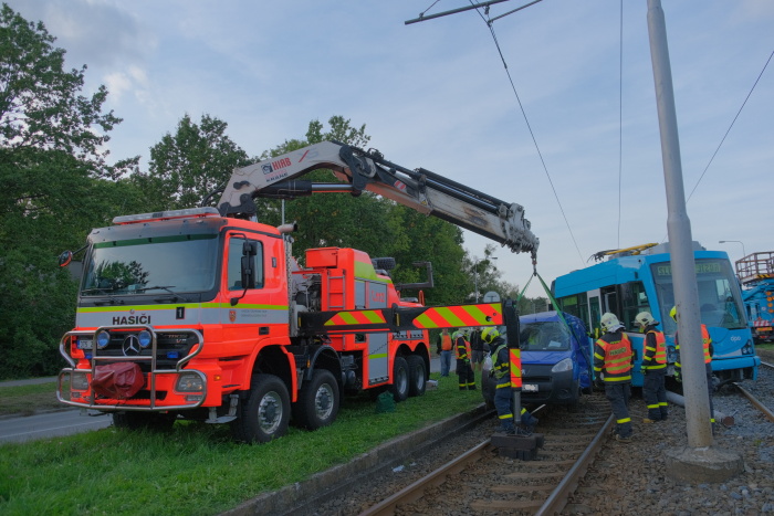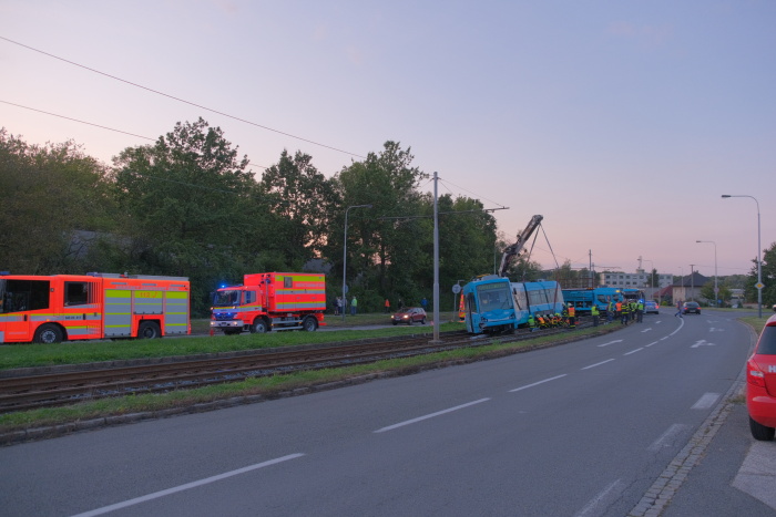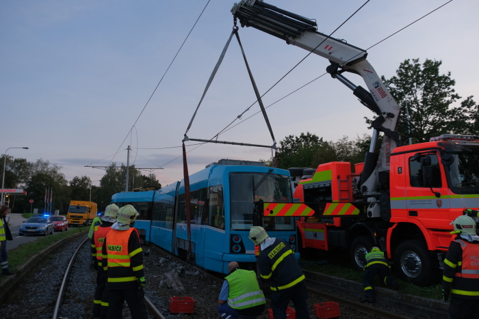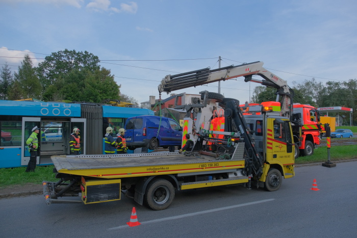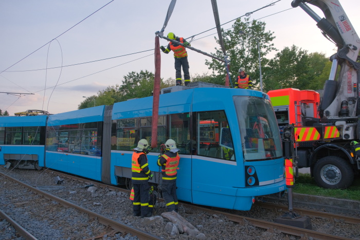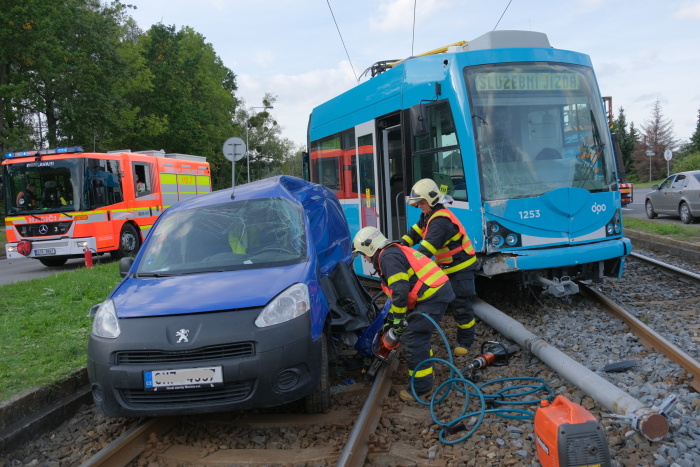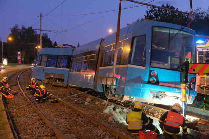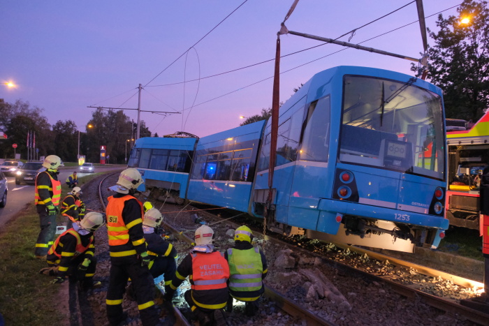 Dvě jednotky profesionálních hasičů (HZS MSK) zasahovaly od pátečního odpoledne 20.9.2019 do noci u nehody tramvaje v Ostravě-Třebovicích, která narazila do odbočujícího osobního auta Peugeot a tlačila jej bezmála 30 metrů před sebou po kolejích. Přitom srazila kovový sloup mezi kolejemi a vykolejila předními i zadními koly. V peugeotu se zranil řidič středního věku, kterého pak hasiči vyprošťovali, a starší spolujezdkyně, v tramvaji další žena.