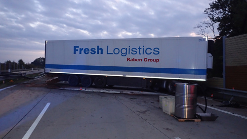 Při nehodě si kamion prorazil palivovou nádrž, část nafty unikla na silnici, mimo komunikaci do trávy i do kanalizace. Hasiči únik zastavili pomocí nasákavého sorbentu a jímacího korýtka a položili na hladinu nedalekého potoka sorpčního hada. Z proražené nádrže přečerpali do náhradní nádoby 60 litrů nafty, otvor potom provizorně opravili tmelem.
