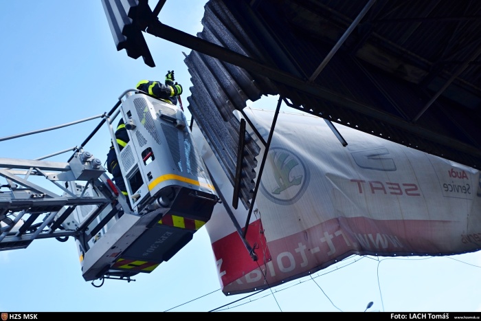 Dvě jednotky hasičů zasahovaly v pondělí 30.9.2019 odpoledne v centru Ostravy na Náměstí republiky, kde silný vítr uvolnil několik plechů z trolejbusové točny a také reklamní plachtu.
