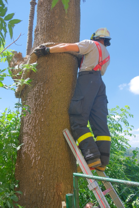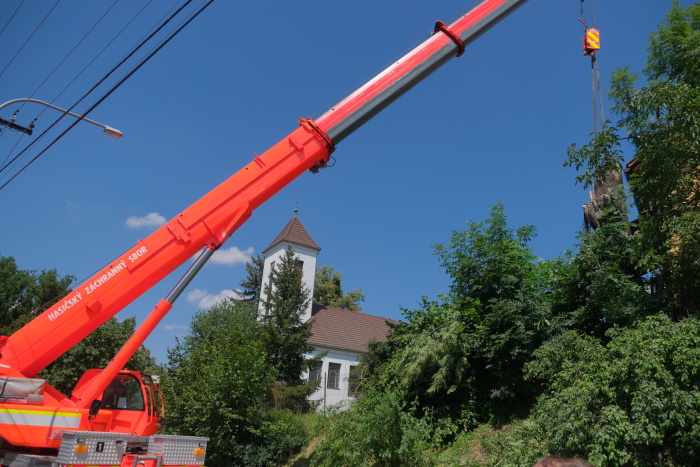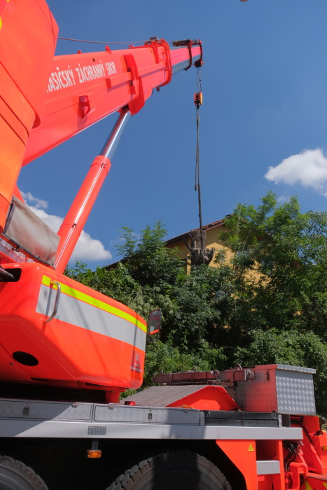 Na bezpečném pořezání stromu o bezmála metrovém průměru kmene u pařezu se podílely dvě ostravské jednotky Hasičského záchranného sboru Moravskoslezského kraje – ze stanic Zábřeh (odtud mj. automobilový jeřáb AJ Demag/Terex a mobilní kontejnerová dílna) a Jih (odtud automobilová plošina AP 30 MB Econic Bronto).
