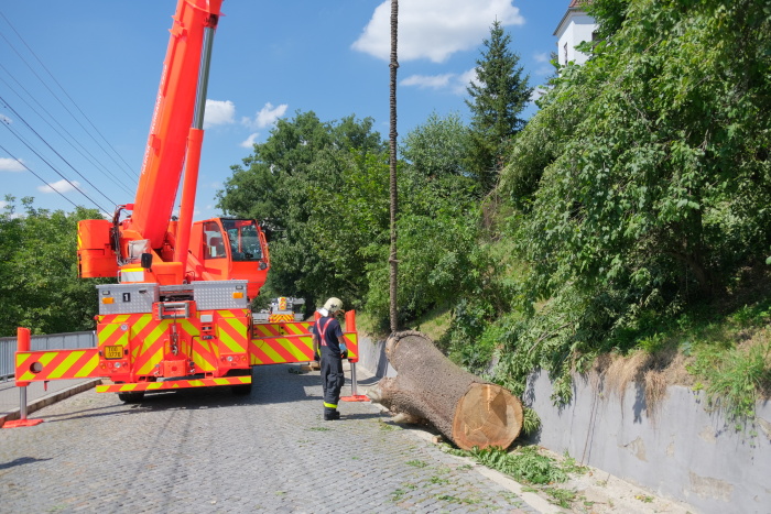 Po uzavření části Světlovské ulice hasiči z koše automobilové plošiny postupně odřezali všechny větve koruny jasanu pomocí motorové pily. Z plošiny také uvázali popruh na silném kmenu, který držel automobilový jeřáb, aby případným pádem těžké dřeviny nebyla poškozena zídka kolem chodníku a plot rodinného domku, kde jasan desetiletí rostl. Dva hasiči se pak střídali v opatrném odřezání spodní části kmene, aby nedošlo k žádným škodám. Jeřáb nakonec snesl několik tun vážící kmen na okraj silnice.