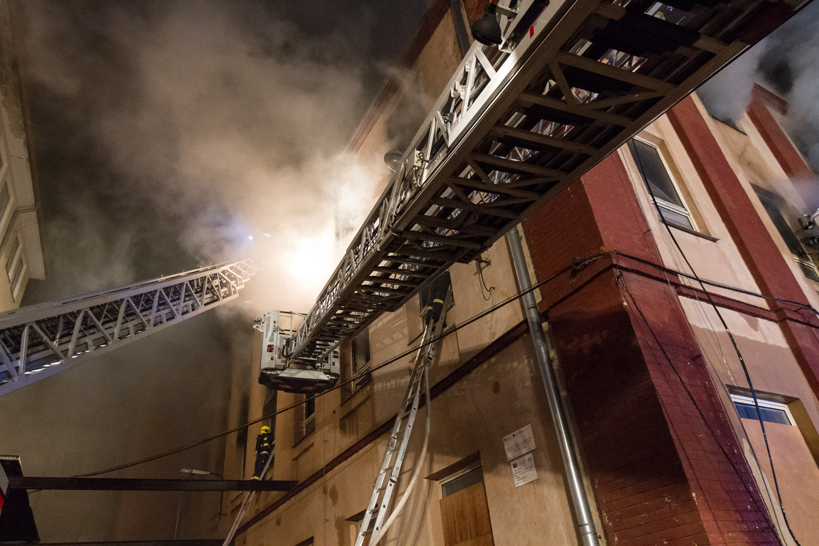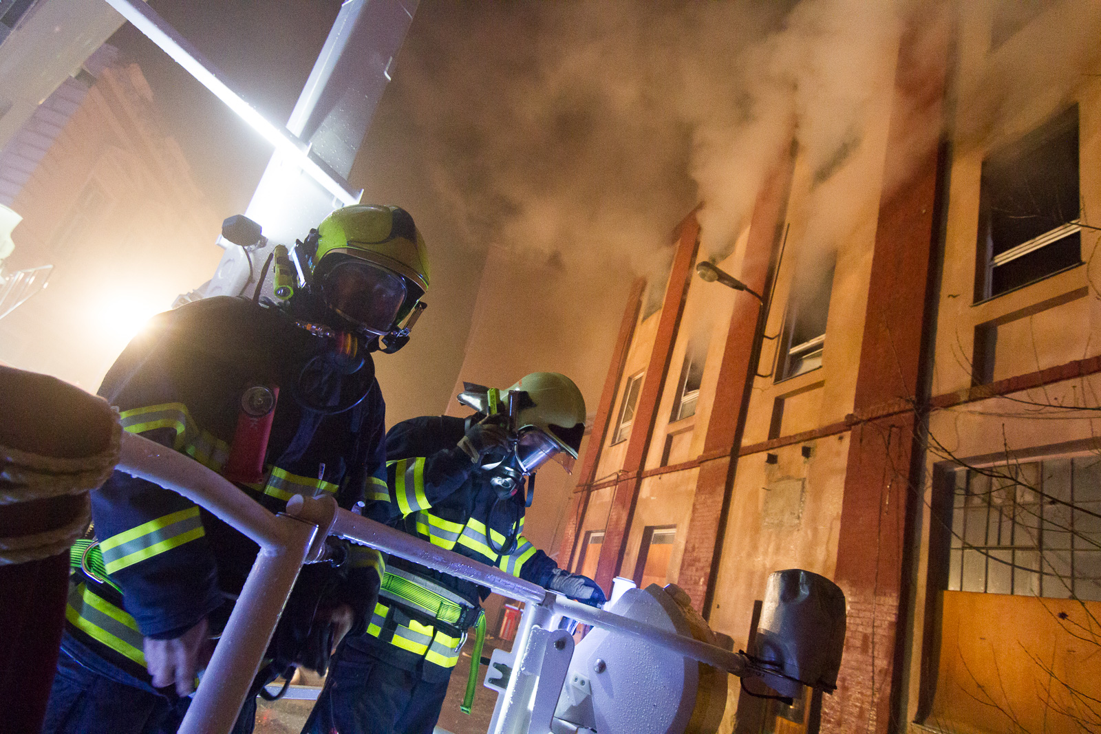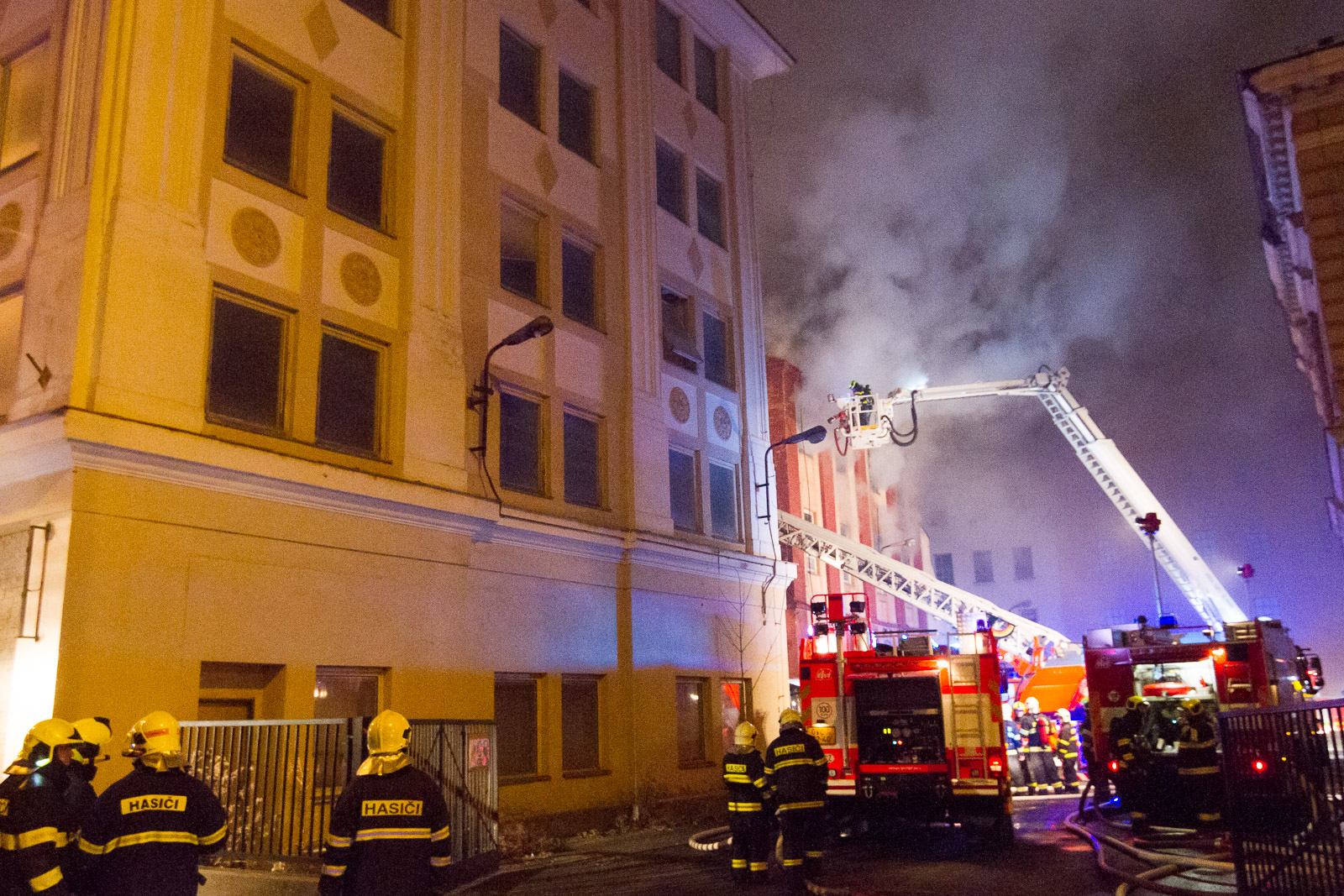Hasiči po příjezdu na místo události zjistili, že je budova silně zakouřená a požár zasáhl obě její křídla ve dvou patrech. Hasiči se dovnitř dostali okny pomocí nastavovacích žebříků a ihned zahájili hasební práce. Povolána byla rovněž výšková technika - jak automobilové žebříky, tak i plošiny.