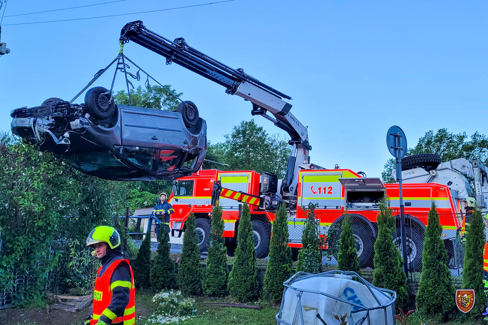 Hasiči s ním havarovaný vůz vyzvedli ze zahrady a postavili na silnici, kde si ho převzala odtahová služba.