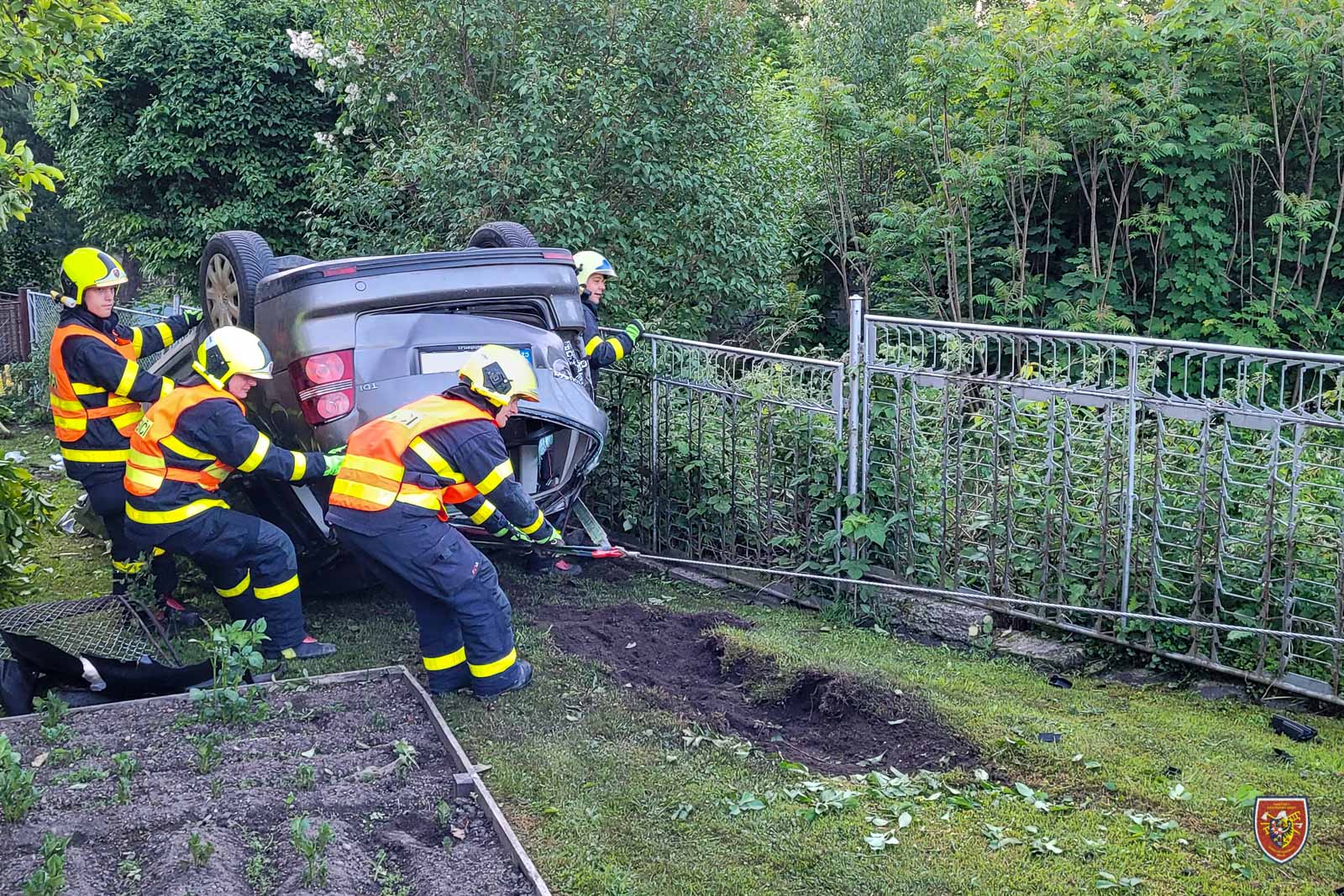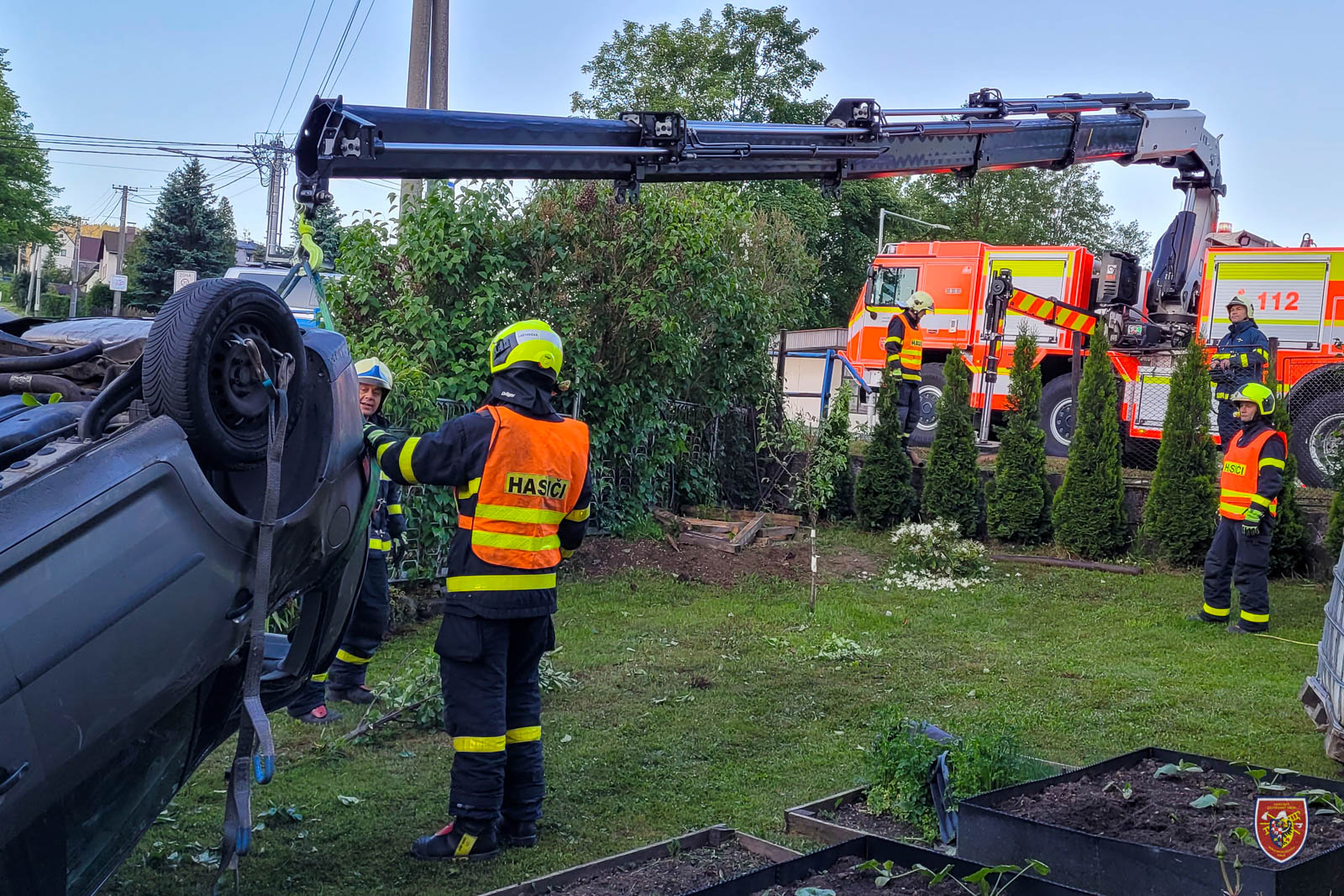 Po příjezdu na místo jednotka průzkumem zjistila, že na zahradě u rodinného domu skončil osobní automobil, při nehodě se převrátil na střechu. Jeden člověk byl zraněn, postarala se o něj zdravotnická záchranná služba.