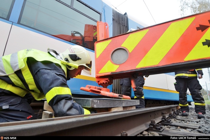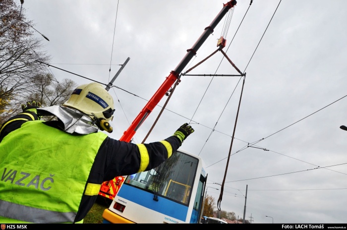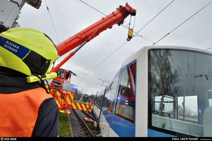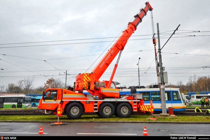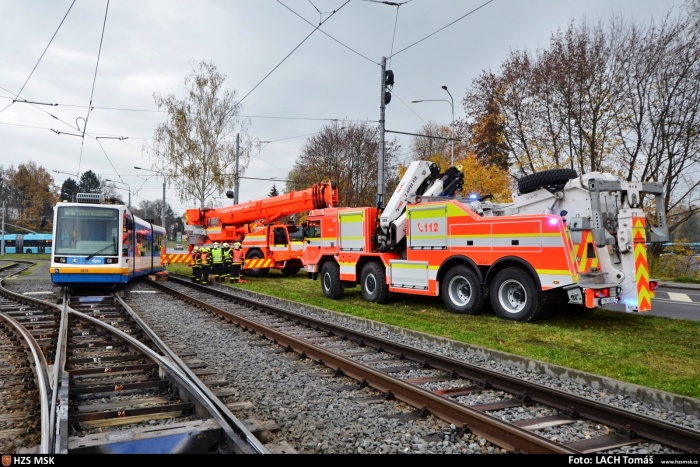 Dvě ostravské jednotky profesionálních hasičů (HZS MSK) pomáhaly ve čtvrtek 10.11.2022 po poledni Dopravnímu podniku Ostrava (DPO) s nakolejením kloubové tramvaje, které se během pojíždění přes výhybku na konečné (smyčce) na Hranečníku ve Slezské Ostravě odklonila zadní část vozidla na nesprávnou kolej. Hasiči využili schopností automobilového jeřábu AJ AC 60 Demag/Terex.