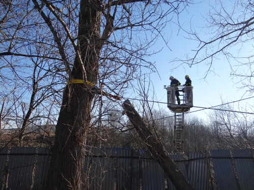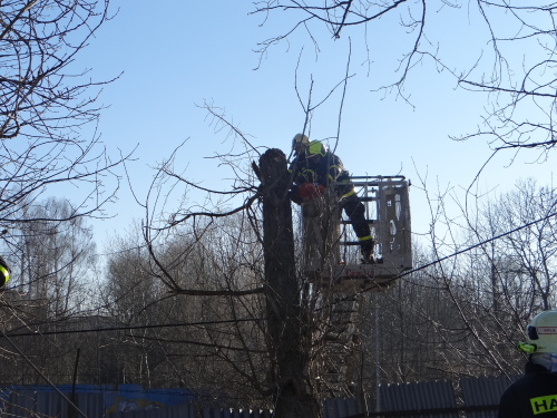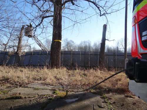 V poslední fázi, kdy už byl kmen likvidovaného stromu díky hasičské pile poloviční, pomohl k dokončení úkolu naviják cisterny, který pomocí kladky, připevněné na sousedním mohutnějším stromě, stáhl nalomený kmen do areálu bývalé ubytovny, pryč od telefonního vedení i poškozeného plotu. Pootočený kmen z posledních sil ještě držel pod úhlem 45 stupňů, bez problémů jej „dorazil“ motorovou pilou jeden z hasičů. Kmen spadl do vyhrazených míst vedle plotu…
